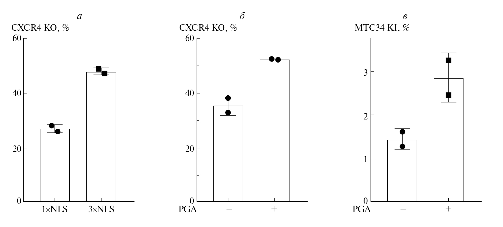 Рис. 2. (а) Уровень нокаута CXCR4 в клетках CEM/R5, электропорированных RNP с Cas9–1xNLS или Cas9– 3xNLS. (б) Уровень нокаута CXCR4 в клетках CEM/R5, электропорированных комплексами RNP с добавлением PGA (+) или без добавления PGA (–). Экспрессию белка CXCR4 анализировали с помощью проточной цитометрии проводили на 3 день после электропорации. (в) Уровень нокина пептида МТ-С34 в локус CXCR4 в CD4+ Т-лимфоцитах, электропорированных RNP с Cas9-3xNLS вместе с донорной плазмидой pJet-X4ex2 в присутствии PGA (+) или без PGA (–).
