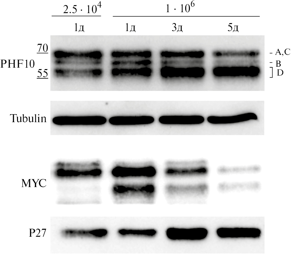Уже через сутки после пассажа роста в клетках, высаженных с более высокой плотностью, наблюдали повышенную экспрессию PHF10D по сравнению с клетками низкой плотности (рис. 3, сравнить 2.5∙104 и 1∙106 через 1 день). С течением времени в клетках, высаженных в высокой плотности, увеличивалась экспрессия ингибитора пролиферации Р27 и падала экспрессия транскрипционного фактора MYC, который стимулирует транскрипцию генов, отвечающих за прохождение G/S «чекпойнта» и прогресс клеточного цикла (рис. 3) [11]. Это указывает, что в клетках RKO при увеличении плотности наблюдалась остановка пролиферации. Экспрессия PHF10D увеличивалась уже через трое суток после пассажа (сравнить 1∙106 через 1 и 3 дня), а через пять дней PHF10D становились преобладающими среди всех изоформ PHF10. Экспрессия PHF10A, C и В уменьшалась в клетках RKO, находящихся в контактном ингибировании по сравнению с пролиферирующими клетками. Таким образом, в культуре клеток человека, как и в фибробластах мыши при возникновении контактного ингибирования начинается интенсивная экспрессия PHF10D изоформы и происходит заметное снижение экспрессии PHF10A и PHF10C-изоформ.