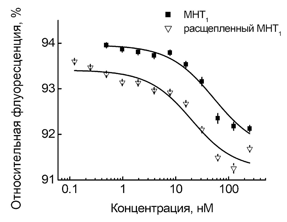 Рис. 1. Зависимости относительной интенсивности флуоресценции (за 100% принята интенсивность флуоресценции до начала термофореза) через 20 с после начала термофореза от концентрации МНТ1 или расщепленного МНТ1 при постоянной концентрации N-белка, меченного AF488 (5 нМ). Указана стандартная ошибка определения относительной интенсивности флуоресценции (14–17 повторов).