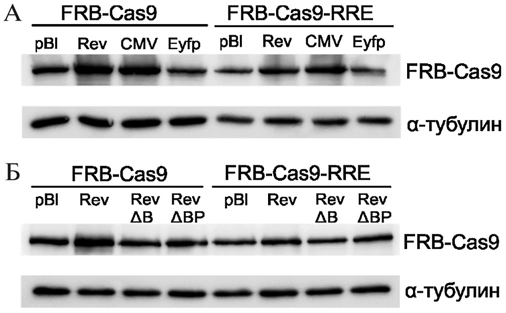 Рис. 3. Оценка специфичности эффекта от экспрессии белка Rev на уровень продукции FRB-Cas9. Лизаты клеток HEK293T, трансфицированных плазмидами для экспрессии FRB-Cas9 c элементами RRE или без таковых (RRE-) вместе с плазмидами (а) для экспрессии белков Rev и Eyfp или контрольными плазмидами pBluescriptSKII(-) (pBl) и pCMV-pA (CMV), или (б) для экспрессии белка Rev, его укороченной формы (Rev∆B), плазмиды с делецией N-концевой части кДНК Rev (Rev∆BP) и контрольной плазмиды (pBl) анализировали с помощью Вестерн-блоттинга с антителами к HA-эпитопу (FRB-Cas9) и α-тубулину для контроля суммарного уровня белка в лизатах клеток. Показаны результаты одного из двух репрезентативных экспериментов.