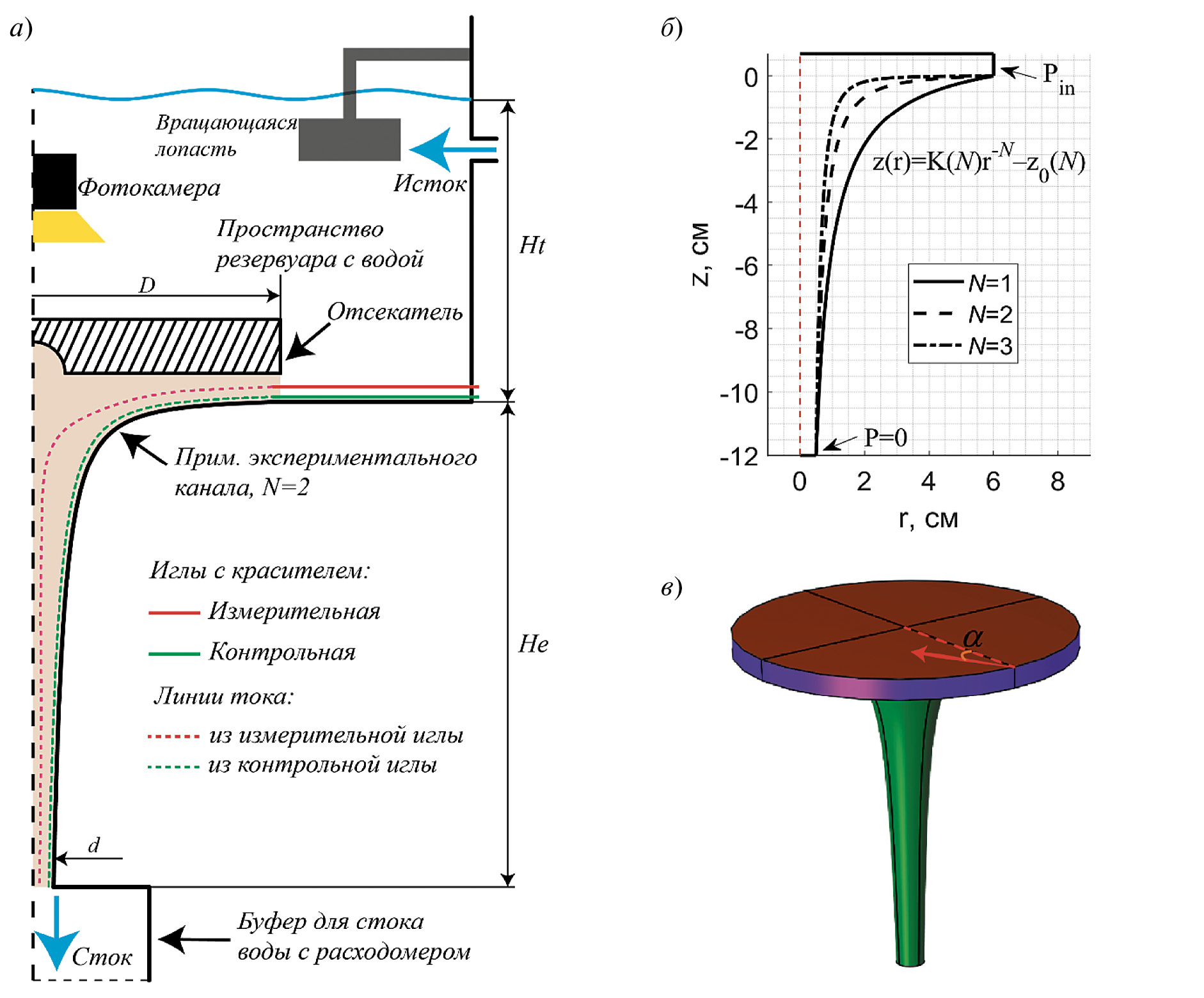 Рис. 2. Схема экспериментальной установки (а) и геометрическая конфигурация численной модели (б, в): а) Ht – высота столба воды в резервуаре с водой, He – высота канала, D – диаметр отсекателя, d – диаметр выходного отверстия канала; б) Pin – задаваемое статическое давление на входе в канал; (в) α – угол скорости жидкости по отношению к нормали поверхности истока. Физическое моделирование для различных геометрических конфигураций канала проводили в воде, перепад давления в канале создавали с помощью столба воды в резервуаре, закрутку жидкости организовывали посредством вращающейся лопасти. Регистрацию расхода проводили на выходе экспериментального канала, линии тока визуализировали посредством введения красителя в канал с применением двух игл: измерительной и контрольной. На рис. 2 б, в показано, что численное моделирование проводили в условиях, идентичных экспериментальным. Граничное условие статического давления на входе в канал изменяли в зависимости от требований моделирования. Создание азимутальной составляющей скорости жидкости осуществляли посредством параметризации угла α между вектором скорости на входе канала к нормали входной поверхности.
