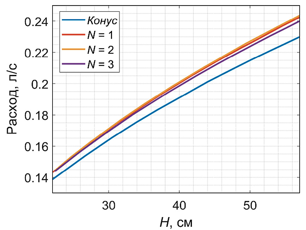 Рис. 3. Зависимость расходных характеристик от высоты столба жидкости в резервуаре для каналов различной формы: Cone – зависимость расхода для канала конической формы. N = 1, 2, 3 – зависимость расхода для каналов zRN = const с указанным показателем степени. Видно, что расходные характеристики для каналов zRN = const имеют малое отличие. Расходные характеристики канала конической формы ниже на 4%.