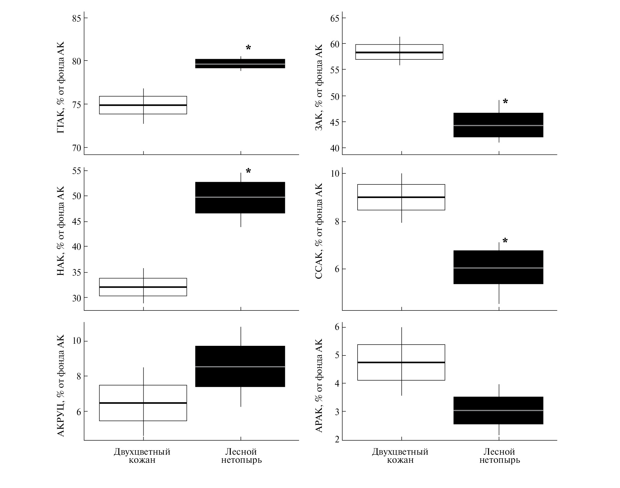 Рис. 1. Содержание метаболических групп аминокислот (% от суммарного фонда) в сыворотке крови перелетных видов летучих мышей. Середина боксплота – среднее арифметическое, границы боксплота – ошибка среднего, “усы” боксплота – доверительный интервал бутстреп-распределения; * – статистически значимые различия между группами “двухцветный кожан” – “лесной нетопырь”.