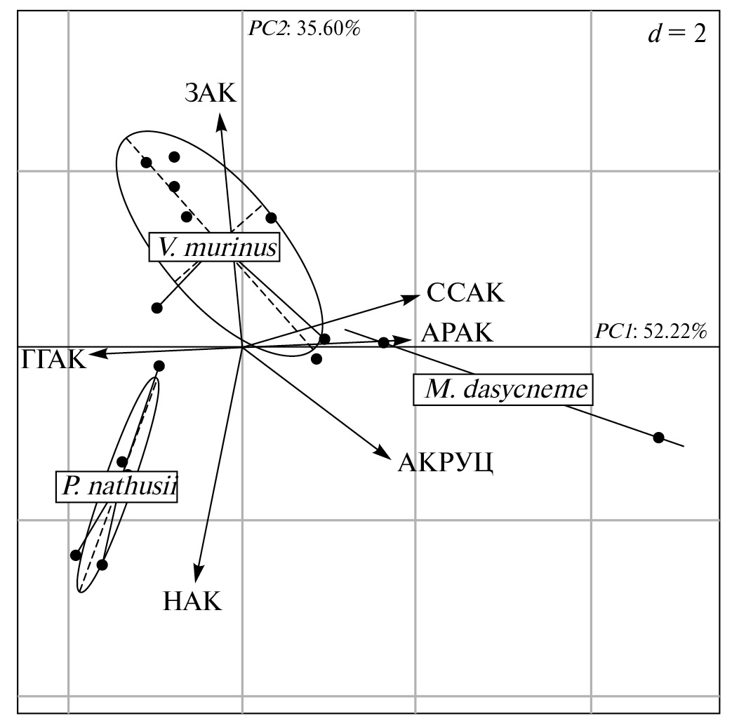 Метод многомерного анализа (PCA) плазмы крови позволяет визуализировать степень содержания метаболических групп свободных аминокислот, модифицирующих основные метаболические потоки в организме трех видов рукокрылых, обитателей уральской фауны, подтверждая результаты представленного исследования (рис. 2). При 95 % доверительном интервале показано, что 52.2 % общей дисперсии метаболических групп аминокислотного фонда плазмы крови рукокрылых приходится на первую главную компоненту (РС1), а 35.6 % – на вторую (РС2) (рис. 2). По представленным переменным первая и вторая главные компоненты обусловливают значимую пространственную дифференциацию основных метаболических групп аминокислот крови двухцветного кожана и лесного нетопыря относительно прудовой ночницы. Первая компонента разделяет кластер прудовой ночницы и группы двухцветного кожана и лесного нетопыря. Показаны высокие коэффициенты корреляции с РС1 и значимый вклад в компоненту ГГАК (31.44 %), ССАК (25.2 %), АРАК (23.20 %), АКРУЦ (17.80 %) (рис. 2).