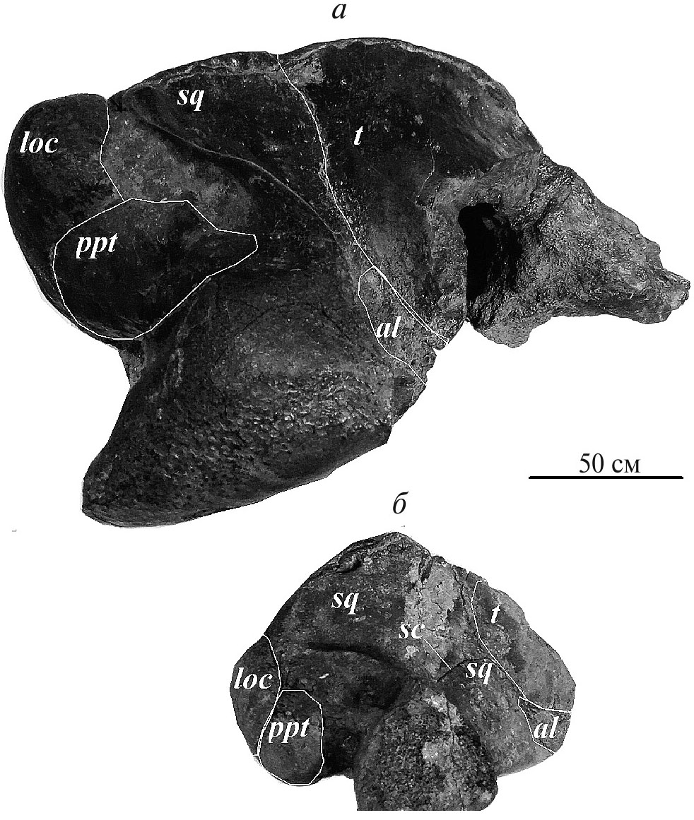 Рис. 1. Строение боковой стенки черепа Kurdalagonus maicopicus (Spasskii, 1951) разного индивидуального возраста: а – лектотип ПИН, №764/1; неполный череп; Россия, Республика Адыгея, левый берег р. Белой, г. Майкоп, местонахождение ГЭС; верхи среднего миоцена, средний сармат, блиновская свита, б – экз. ПИН 5462/ 84; фрагмент черепа; Россия, Республика Адыгея, Майкопский р-н, долина р. Фортепьянки, местонахождение Фортепьянка 2; верхи среднего миоцена, средний сармат, блиновская свита. Обозначения: al – клиновидная кость; loc – боковая затылочная кость; ppt – задний отросток каменистой кости (сосцевидный отросток); sc – щель чешуйчатой кости; sq – чешуйчатай кость; t – теменная кость.