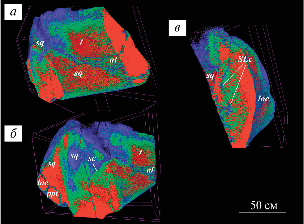 Рис. 2. 3D визуализация боковой стенки черепа Kurdalagonus maicopicus (Spasskii, 1951), экз. ПИН 5462/ 84, фрагмент черепа; Россия, Республика Адыгея, Майкопский р-н, долина р. Фортепьянки, местонахождение Фортепьянка 2; верхи среднего миоцена, средний сармат, блиновская свита: a – латерально с виртуальным сагиттальным срезом через основание скулового отростка чешуйчатой кости; б – антеролатерально с виртуальным поперечным срезом через клиновидную и теменную кости, виртуальным сагиттальным срезом через основание скулового отростка чешуйчатой кости; в – виртуальный сагиттальный срез стенки черепа Kurdalagonus maicopicus (Spasskii, 1951) через шов чешуйчатой-боковой затылочной кости. Красным обозначены более плотные участки кости, зеленым, сине-зеленым и синим менее плотные, отверстия, пустоты и швы – темно-синий цвет. Обозначения: al – клиновидная кость; loc – боковая затылочная кость; ppt – задний отросток каменистой кости (сосцевидный отросток); sc – щель чешуйчатой кости; sq – чешуйчатай кость; SLc – шов между чешуйчатой и боковой затылочной костями; t – теменная кость.