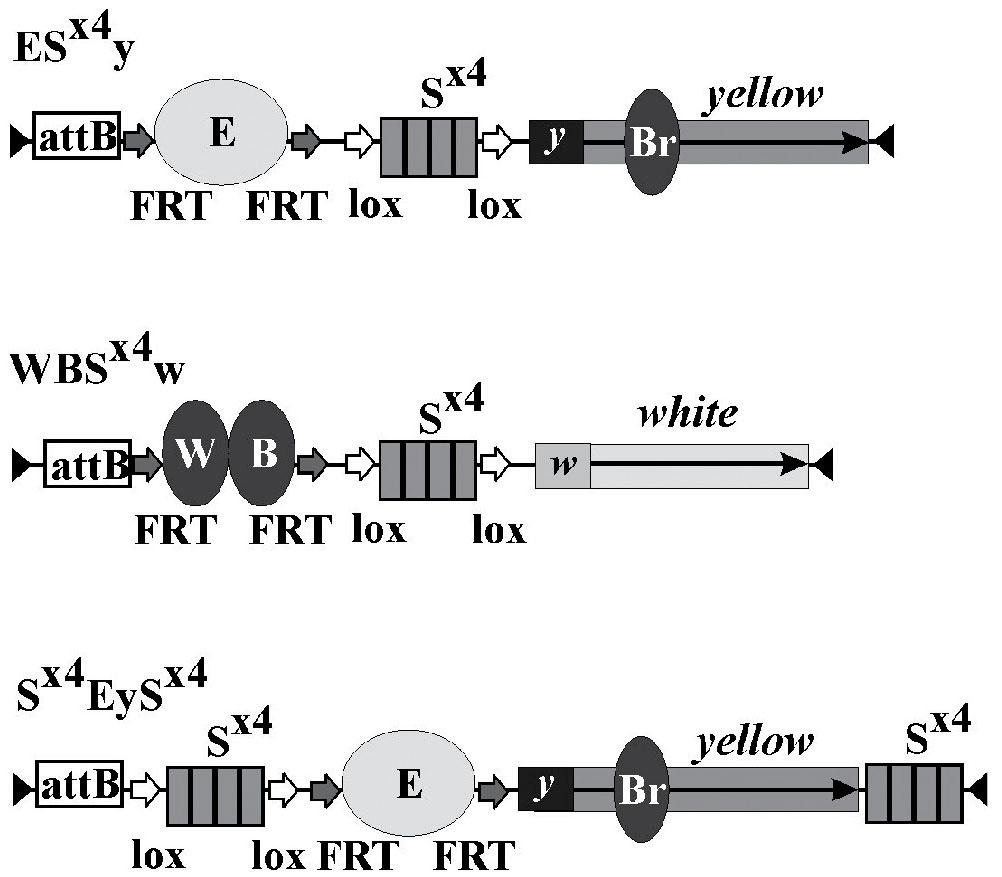 Мы сконструировали три трансгена, каждый из которых содержал сайт attB и искуственно созданные последовательности для связывания белка Su(Hw) (S×4) [18], окруженные сайтами loxP. Трансгены S×4EyS×4 и ES×4y включали энхансер глаз (E), окруженный сайтами FRT и репортерный ген yellow (y). Трансген WBS×4w включал окруженные сайтами FRT энхансеры тела и крыльев (WB) и репортерный ген white (w) (рис. 1). С помощью φC31-зависимой рекомбинации [19] все трансгены были интегрированы в геномный район 2R:11890256 линии y1w1118 с полностью инактивированными генами yellow и white, в интрон гена ERp60, куда предварительно был интегрирован сайт attP. Согласно данным Chorogenome Navigator (http://chorogenome.ie-freiburg.mpg.de/), этот район относится к транскрипционно активному хроматину и не содержит эндогенные сайты для связывания каких-либо известных инсуляторных/архитектурных белков.