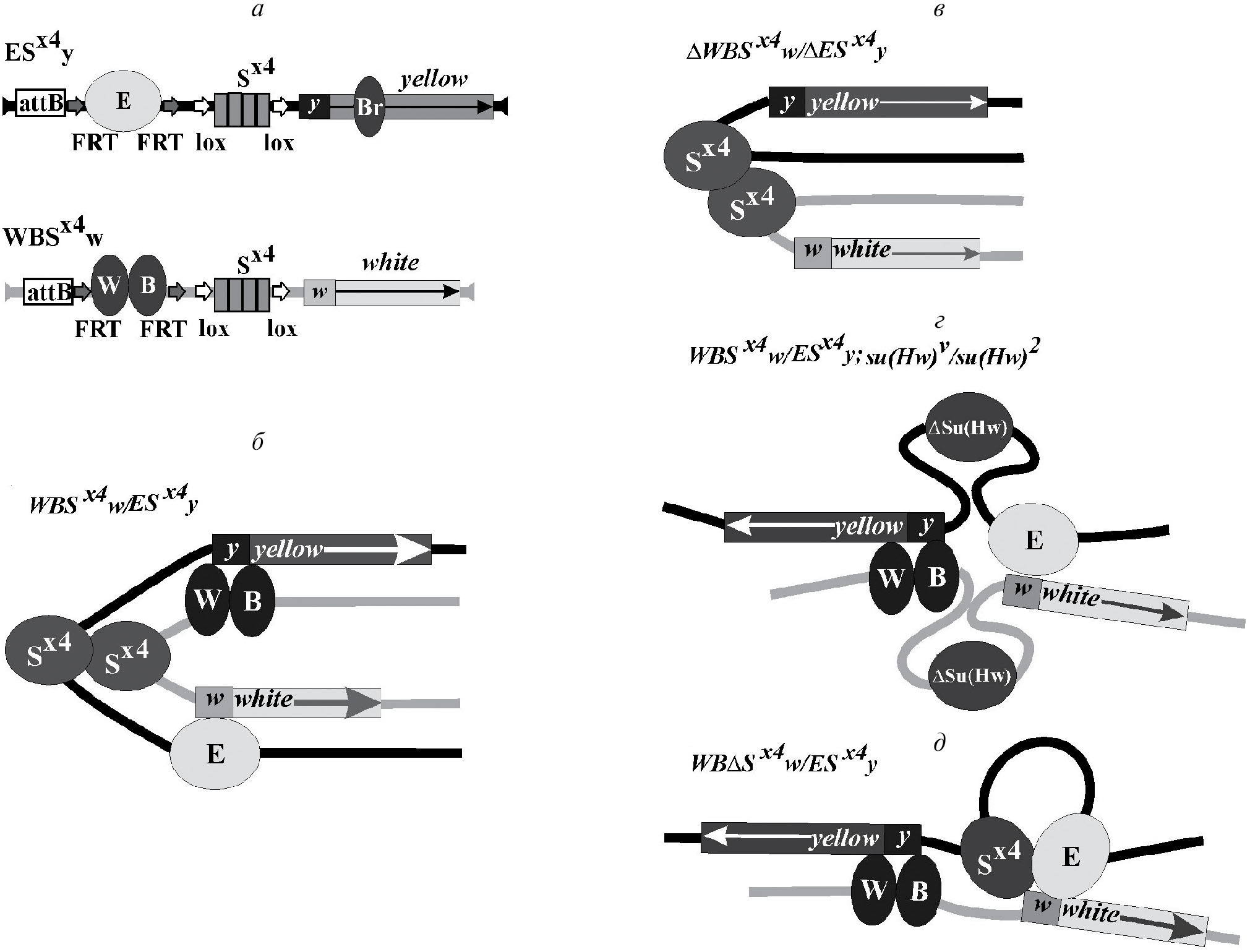 Чтобы выявить роль энхансеров в активации каждого из репортерных генов мы скрестили между собой производные линии с делетированными энхансерами. Следствием вырезания энхансеров в полученной транс-гетерозиготе ΔWBS×4w/S×4ΔEyS×4 стало снижение транскрипции модельных генов до базового уровня (желтые глаза, светлое тело и крылья) (табл. 1). Поэтому даже 3 инсулятора S×4 не способны самостоятельно активировать экспрессию репортеров в случае транс-взаимодействия (рис. 3б).