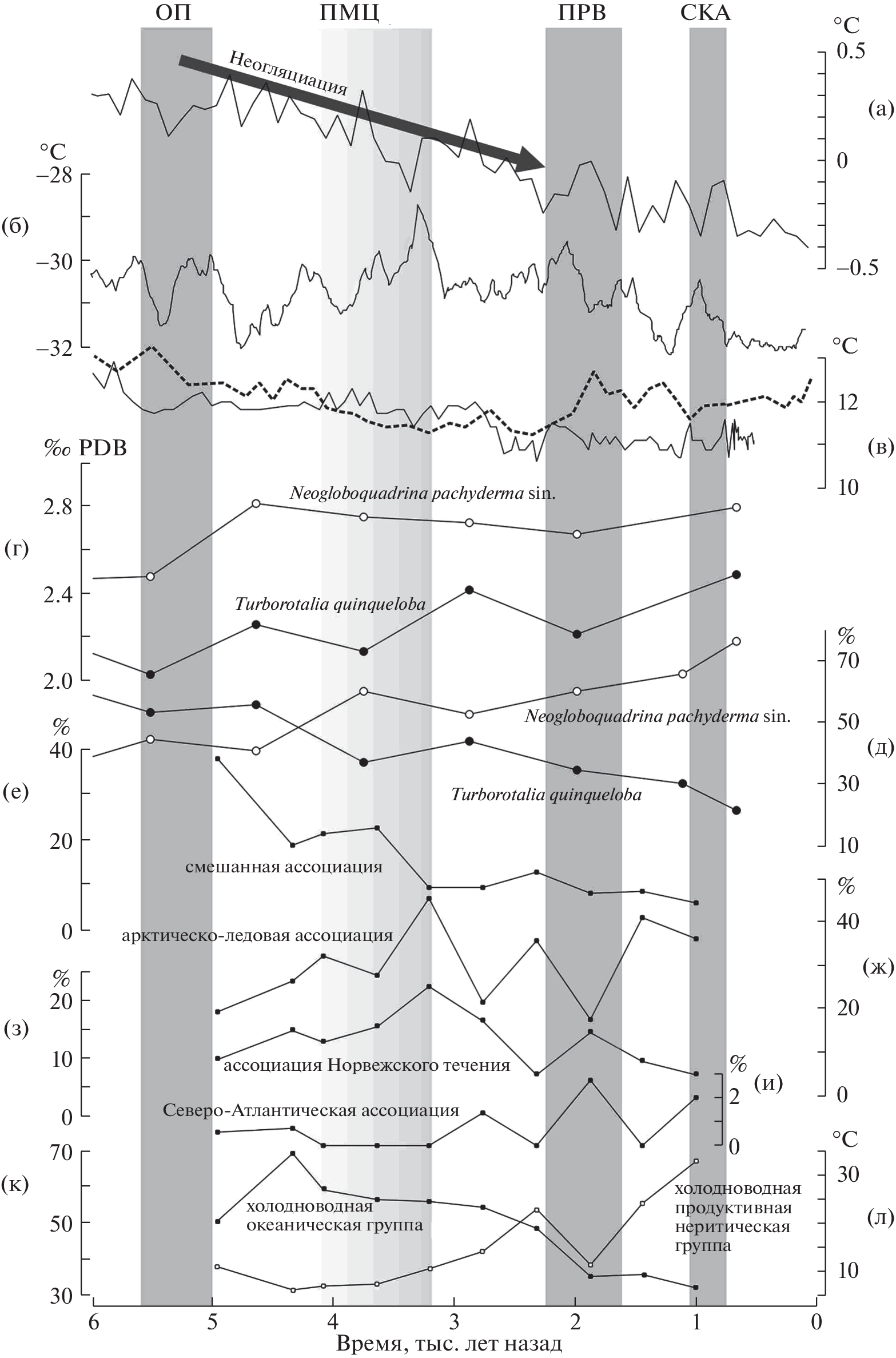 - Orme L.C., Miettinen A., Divine D.V., Husum K., Pearce C., Van Nieuwenhove N., Born A., Mohan R., Seiden-krantz M.-S. Subpolar North Atlantic Sea surface temperature since 6 ka BP: Indications of anomalous ocean-atmosphere interactions at 4–2 ka BP // Quaternary Science Reviews. 2018. V. 194. P. 128–142.