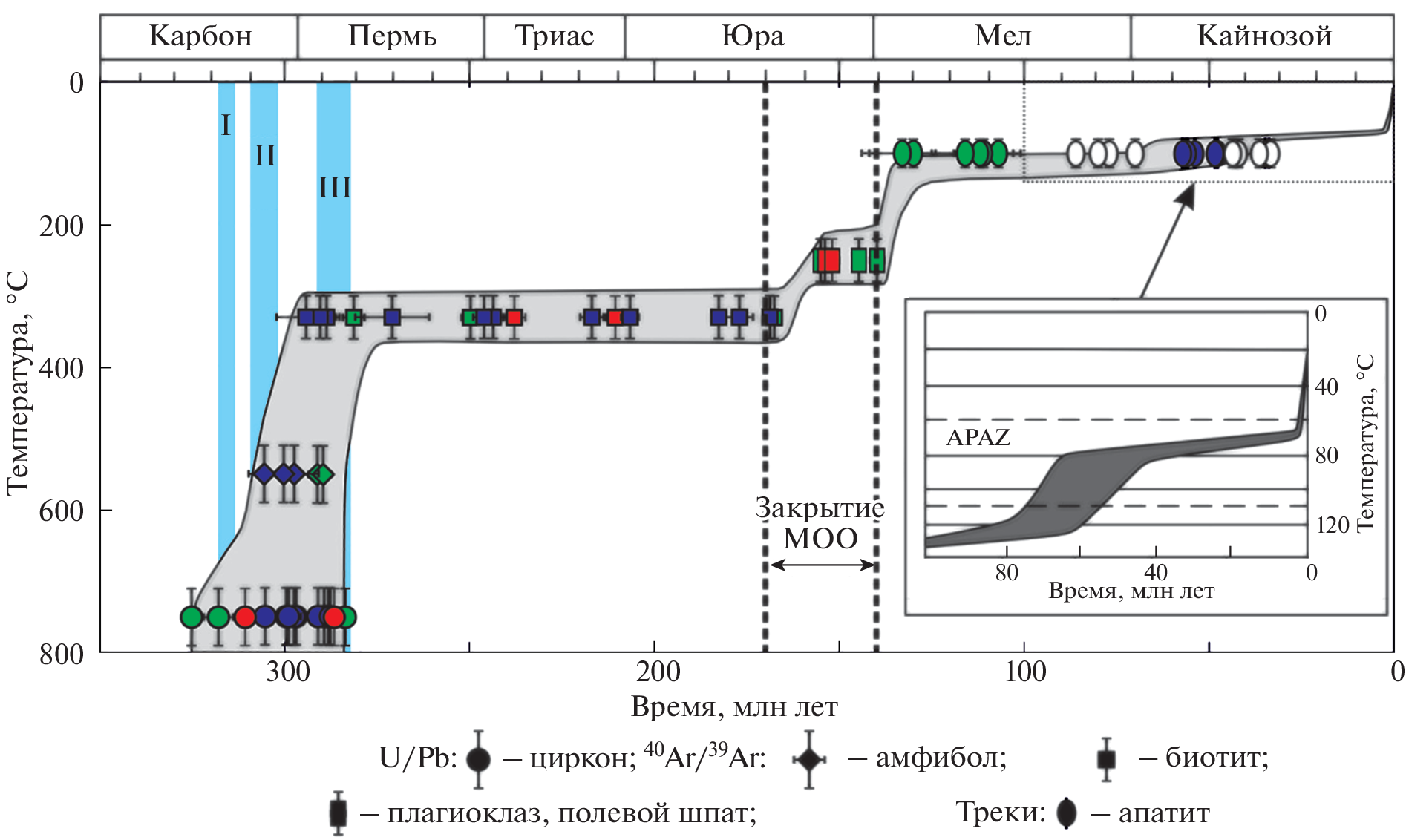 The thermal history of the Late Paleozoic granitoids of the Angara-Vitim batholith (ABB) was reconstructed using a multi-system approach including U/Pb, 40Ar/39Ar, and fission track dating methods. The rocks of the Barguzinsky and Chivyrkuysky complexes were studied at sites in the southwestern and northeastern parts of the batholith, as well as on the Svyatoy Nose Peninsula and the eastern shore of Lake Baikal. The similar thermal history is reconstructed for the rocks of all sites as a whole. The steep position of the thermal history graph immediately after the formation of the ABB rocks indicates a major denudation epoch with an amplitude of about 7–5 km associated with the Late Paleozoic orogeny. After the epoch of tectonic stabilization, characterized by the time-stretched closure of the biotite isotope system, the closure of the feldspar/plagioclase isotope system occurs in the range of 170–140 Ma. This interval coincides with the closure of the Mongol-Okhotsk Ocean and the beginning of the formation of the orogen of the same name and is characterized by an amplitude of denudation of about 3 km. Further, in the period of 60–3 Ma, a slow denudation took place on the territory of Transbaikalia, which ended with a relatively sharp cooling of rocks during the last 3 Ma and denudation with an amplitude of about 3–2 km. This may be due to the long-range tectonic impact of the Indo-Eurasian collision. The obtained data on the tectonic-thermal evolution of AVB rocks can serve as a basis for identifying the relationship with the formation of the Mongol-Okhotsk orogen and sedimentation in the Jurassic-Early Cretaceous Irkutsk, Kansk-Achinsk, Tuva, Kuznetsk and West Siberian basins.