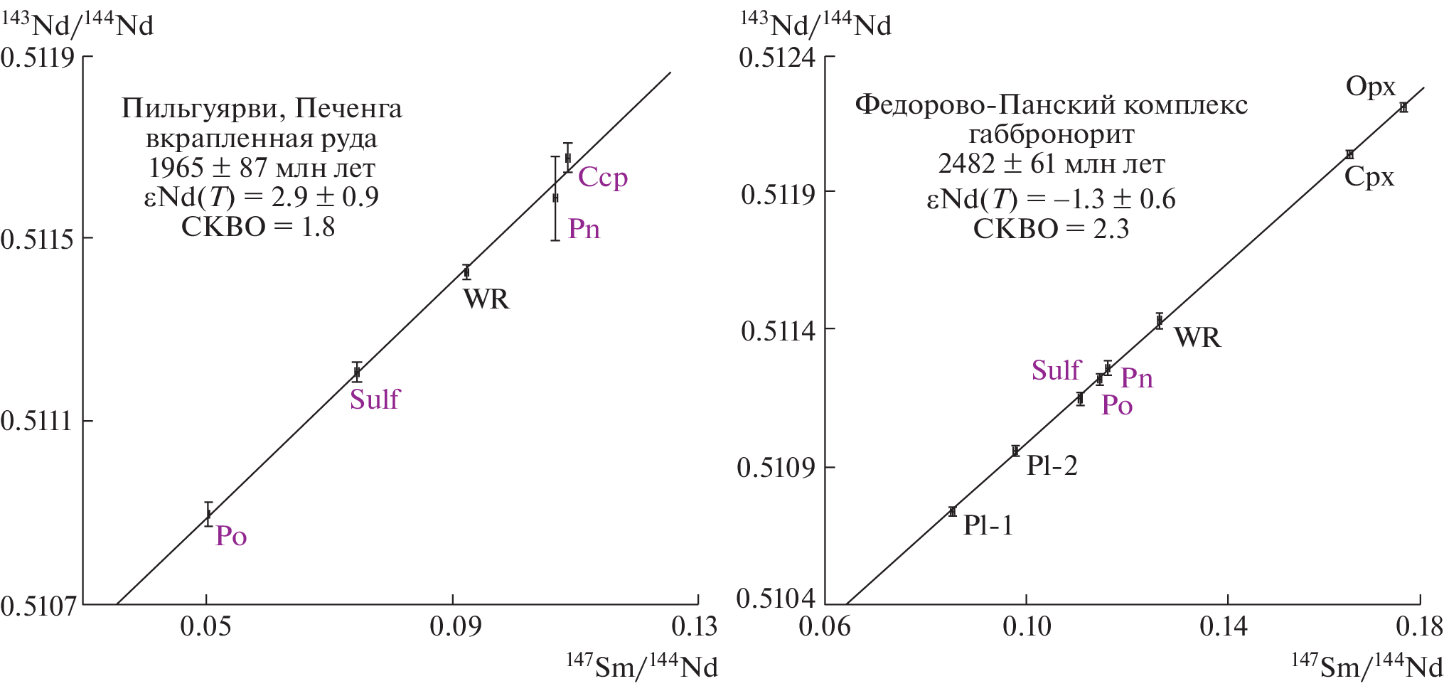 A microtomographic study of the internal structure of sulfide minerals from ore varieties of rocks of two industrial deposits of the Arctic zone of the Russian Federation – disseminated ore of the Pilgujarvi Cu–Ni deposit of Pechenga and ore gabbronorites of the platinum-bearing Fedorovo-Pansky complex (Kola Peninsula) was carried out. It is shown that all studied sulfide samples have a homogeneous structure without obvious defects or silicate inclusions larger than 1 µm. The absence of silicate microinclusions larger than one micron in sulfides suggests an isomorphic form of REE occurrence in sulfides and, to some extent, eliminates the debatable problem of the influence of microinclusions on the results of Sm–Nd isotope-geochronological studies of sulfides. The presence of smaller (10–500 nm) silicate microinclusions is highly likely to be unable to control the total REE budget in a sulfide mineral. The conclusion about the absence of a significant effect of microinclusions on the obtained ages is confirmed by the results of Sm–Nd dating using sulfides from the same mineral samples: the Sm–Nd ages of the ores of the Pilgujarvi Cu–Ni deposit were 1965 ± 87 Ma; ore gabbronorites of the Fedorovo-Pansky complex – 2482 ± 61 Ma, which is in good agreement with the dates obtained earlier using other isotopic systems (U–Pb, Re–Os).