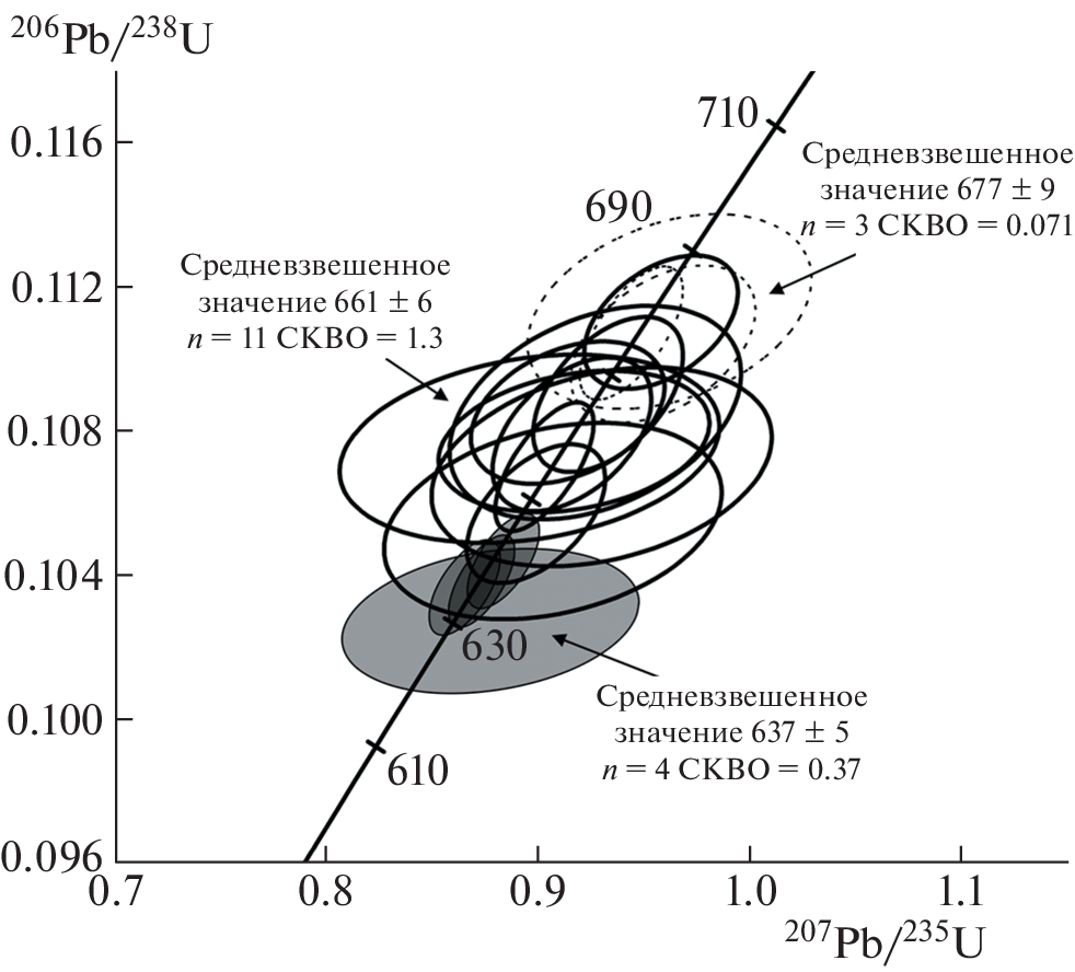 Представлены результаты геохронологического исследования (U–Pb SHRIMP-II) циркона из гранодиоритов и плагиогранитов главной фазы Таллаинского плутона Байкало-Витимского пояса. Полученные оценки возраста магматических ядер циркона гранодиорита и плагиогранита в пределах ошибок совпадают друг с другом и интерпретируются как возраст кристаллизации пород главной фазы Таллаинского плутона 661 ± 6 млн лет. Средневзвешенное значение возраста метаморфических оболочек циркона этих пород составляет 637 ± 5 млн лет. Высокие положительные значения ɛNd(660) +7.2 и +7.3 в породах главной фазы указывают на ювенильный источник родоначальных расплавов. На основании новых и ранее опубликованных геохронологических данных сделан вывод о формировании однотипных позднебайкальских ювенильных габбро-гранитных ассоциаций Байкало-Витимского пояса на рубеже 660 млн лет (таллаинский комплекс) и 603–615 млн лет (падоринский комплекс).