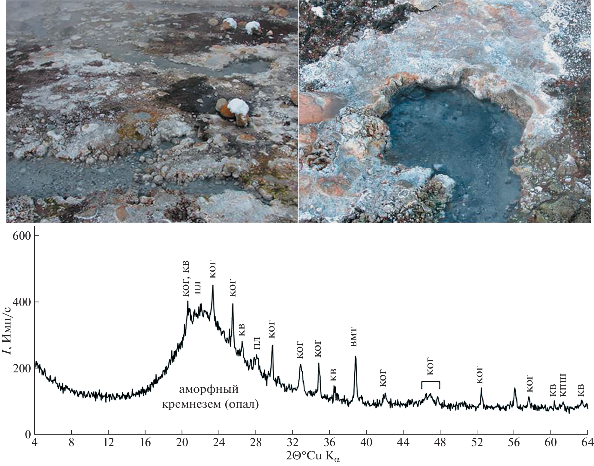 При гидрогеохимическом опробовании Могойского термального источника в Северном Забайкалье отобрано 5 проб современных минеральных осадков, в двух из которых в составе гейзерита главным компонентом является опал, а в трех других преобладают карбонаты, фториды и сульфаты натрия. Расчеты глубинных температур показали, что образование гейзерита связано с низкотемпературными гидротермами и объясняется снижением их температур при разгрузке. Отложение легкорастворимых солевых минералов происходит на испарительном барьере, в дождливый период они могут полностью растворяться и исчезать.
