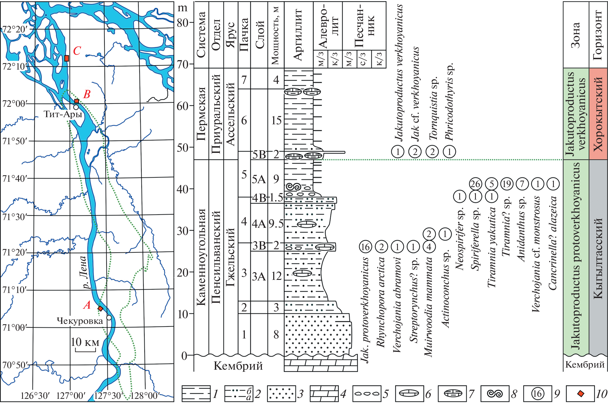 A vertical sequence of brachiopods was revealed at the base of the Verkhoyanian terrigenous complex of the Tit-Ary section in the northern part of the Tuorasis uplift of the lower reaches of the Lena River. As a result of the study of these brachiopods, it was established that in the indicated section, the Upper Cambrian dolomites are overlain by Gzhelian and Asselian deposits, characterized by brachiopods of the Jakutoproductus protoverkhoyanicus and Jakutoproductus verkhoyanicus biostratigraphic zones. This is the first proven fact of the presence of Upper Carboniferous deposits in the area. It is concluded that within the Tuorasis uplift from south to north, the upper age limit of the unconformity between the Cambrian and the Upper Paleozoic is growing older, while the base of the Verkhoyanian terrigenous complex is built up by the Permian basal beds and the Gzhelian deposits of the Upper Pennsylvanian. The Tit-Ary section is the first of those established in the lower reaches of the Lena River, with exposed boundary Carboniferous-Permian beds.