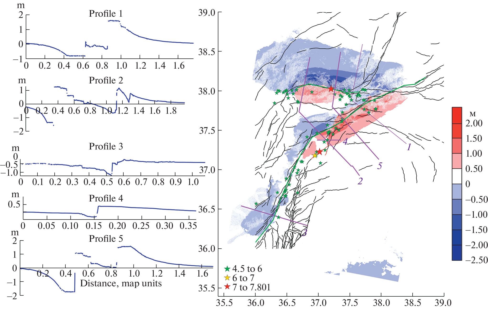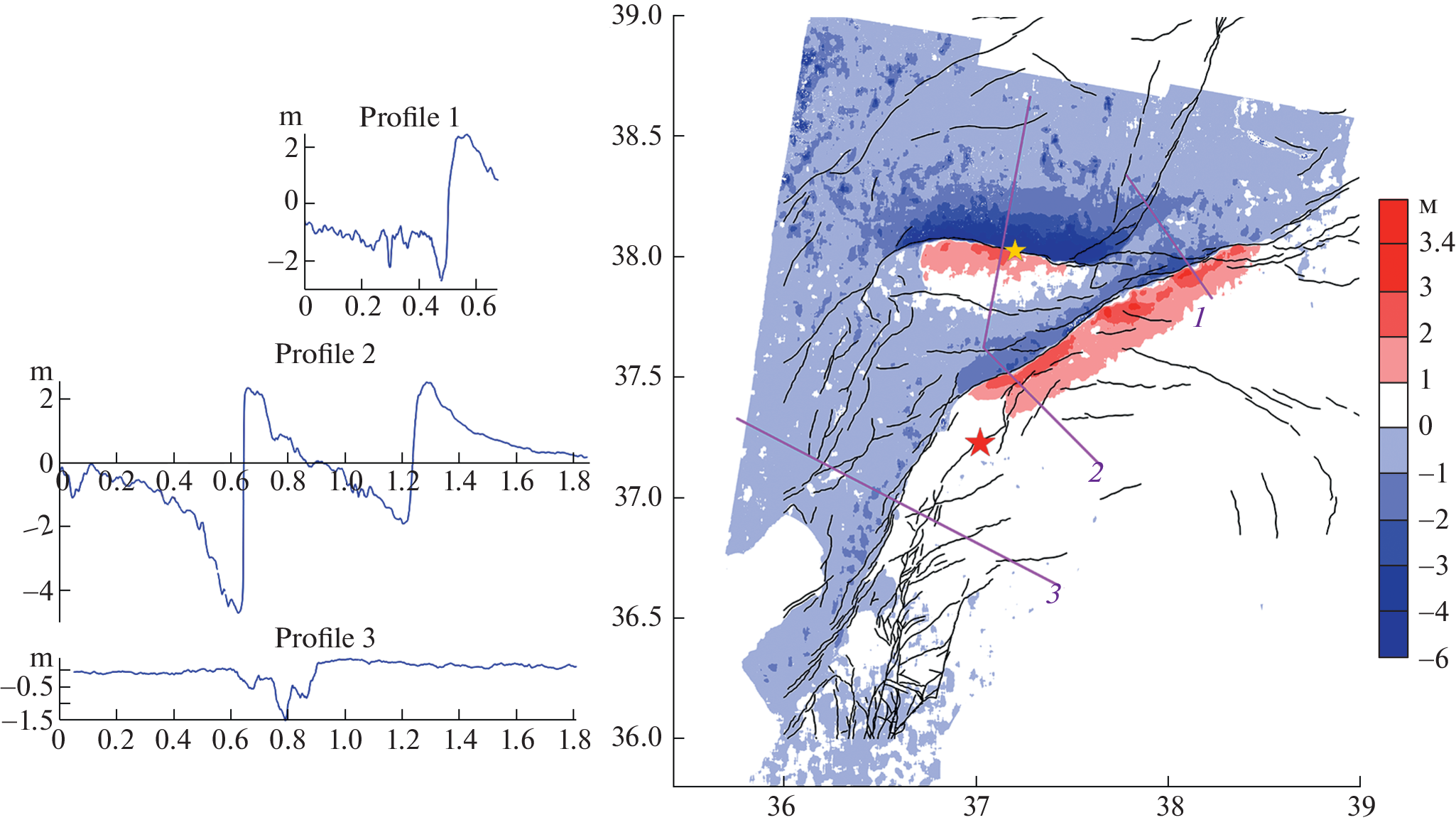 Satellite radar interferometry data made it possible to clearly map two faults, shear displacements along which caused catastrophic earthquakes on February 06, 2023 in Turkey. According to satellite data, the relative displacements of the sides of the East Anatolian Fault Zone (EAFZ), to which the first event with a magnitude of Mw 7.8 was associated, exceeded 5 m in the central segment. The rupture surface extends from the area of the Doğanyol-Sivris of 24.01.2020 Mw 6.7 earthquake in the north to the Mediterranean coast in the south, where the earthquake Mw 6.3 occurred on 20.02.2023. The second event of Mw 7.5 is associated with the Surgü-Çardak fault, and the relative displacements of its sides, according to satellite data, exceeded 7 m. The obtained displacement fields of the Earth’s surface were used to construct a model of the seismic rupture. The model is based on the solution [5], which defines displacements on the surface of a spherically stratified planet as a result of dip and strike displacements on a rectangular rupture located inside the sphere. Ignoring the spherical stratification of the planet leads to errors of up to 20%, especially in the presence of a large shear component [5]. Also, an error is introduced by ignoring sphericity when using the solution obtained for an elastic homogeneous half-space [6], as the US Geological Survey (USGS) did when building seismic rupture models for earthquakes in Turkey in 2023. The difference of our model is the detailed consideration of the fault geometry. For this purpose, the faults were approximated by 19 planes along the strike, divided into two levels along the dip. In the built model, shear displacements in the central segment of the EAFZ reached 12.7 m. In the southern segment of this rupture, the displacements are substantially smaller. It should be emphasized that we registered the displacements for the period from January 29 to February 10, 2023, i.e. together with coseismic ones, they also include postseismic displacements for 4 days after the main seismic events. The displacements on the rupture surface along the Surgü-Çardak fault, where an Mw 7.5 earthquake occurred, reached 10 m. The obtained results demonstrate, in particular, the efficiency of application of satellite radar interferometry in the operative study of catastrophic geodynamic phenomena and processes.