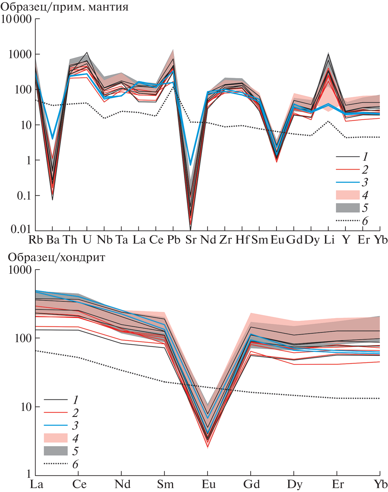 Based on the method of investigation of melt inclusions using electron and ion microprobe, the magma composition and formation conditions of comendites of the Early Mesozoic Adaatsag volcanic association (Mongolia) were studied. The mechanisms leading to the accumulation of rare and rare earth elements in them were determined. Melt and fluid inclusions are found in quartz from the comendites, collected from different parts of the volcanic sequence. The melt inclusions consist of glass, a gas bubble and daughter minerals represented by fluorite, polylithionite and potassium feldspar. The use of the Raman spectroscopy method made it possible to study the composition of the gas phase in melt inclusions. It is determined that the predominant components of the gas phase are water and hydrogen. Fluid inclusions are represented by aqueous solutions that correspond to KF in composition. The concentration of KF in the solution reach up to 4.0–4.1 wt. %. Thermometric experiments with melt inclusions and analysis of the composition of glasses of homogenized melt inclusions in quartz of the comendites showed that the crystallization of magmas of these rocks occurred from water-saturated rare-metal melts with high contents of Li, Zr, F, Rb, Nb, Y and Th at temperatures of 880–930°C and at a pressure of 1000 bar at a depth of ~3.5 km and was accompanied by degassing processes. Comparison of the obtained data on the study of melt inclusions in the phenocrysts of the alkali-salic rocks of the same age volcanic associations Adaatsag, Dzarta-Кhuduk and Sant, developed within the Kharkhorin rift zone, revealed general patterns of their magma evolution. This allowed us to propose a similar mechanism of their formation, involving the accumulation of many rare and rare-earth elements, as well as volatile components (F, H2O) in the process of crystallization differentiation. Subsequently, a salt melt rich in Li, F and water could be separated from such comendite magmas. The detection of fluoride aqueous inclusions in quartz allows us to suppose the further evolution of the salt melt leading to the appearance of a concentrated aqueous fluid and the possible participation of the latter in metasomatic processes.
