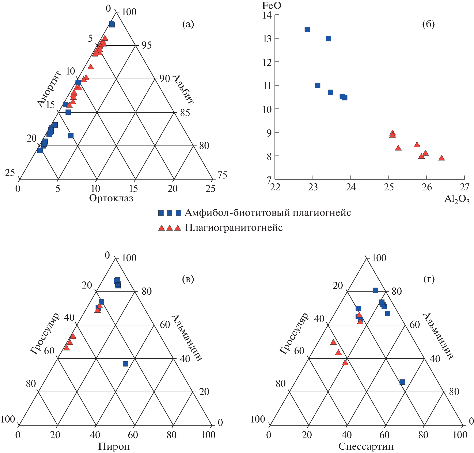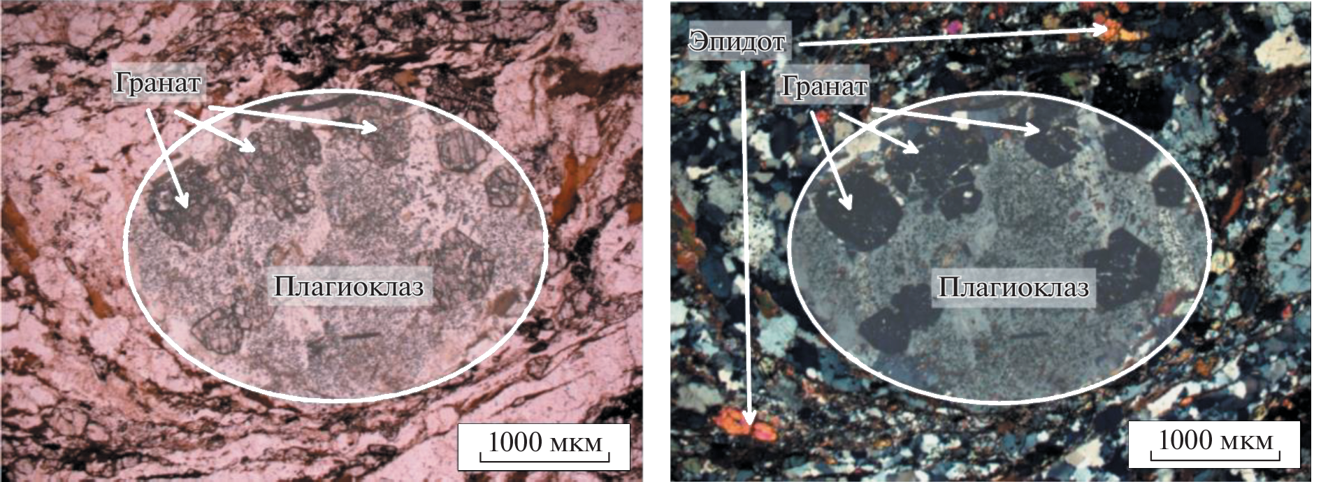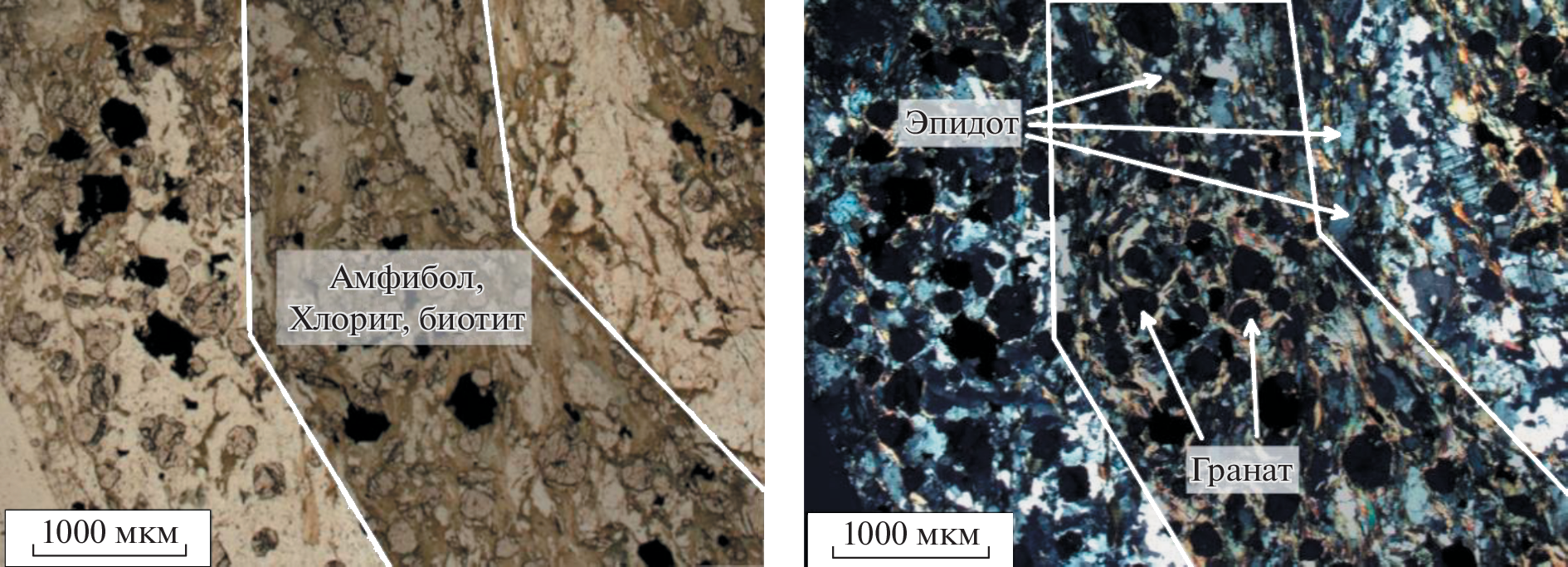In this paper we compare metamorphic transformations in acid and mafic rocks in a zone of intense tectonic movements. The object of study is the exhumed part of damage zone of Primorsky fault – main collision suture, which connects the Siberian Craton and the Olkhon Terrane. The studied area is located near the Khorga River. Collected metamorphic rock samples are represented by both acid (plagiogranitegneiss) and mafic (amphibole-biotite plagiogneisses) rocks. The samples present two different parent rocks contacting each other but differ in chemical composition. The formation of identical metamorphic minerals belonging to the groups of garnet and epidote is noted in both types of rocks. Mineral formation was associated with high-pressure regional metamorphism and possibly with later collision. Studying chemical composition of rock-forming minerals has allowed to determine the P-T condition of metamorphism in these rocks via the method of multimineral thermobarometry. It was established that conditions of early metamorphism retain in amphibole-biotite plagiogneiss. Early metamorphism is characterized by high-pressure amphibolite facies of medium temperature next to eclogite facies. In plagiogranitegneisses were found conditions of later metamorphism that formed rocks at the same pressure but at a lower temperature in the paragonite-kyanite-zoisite subfacies of the eclogite facies next to the greenschist facies. Minerals formed in the early metamorphism are poorly preserved.