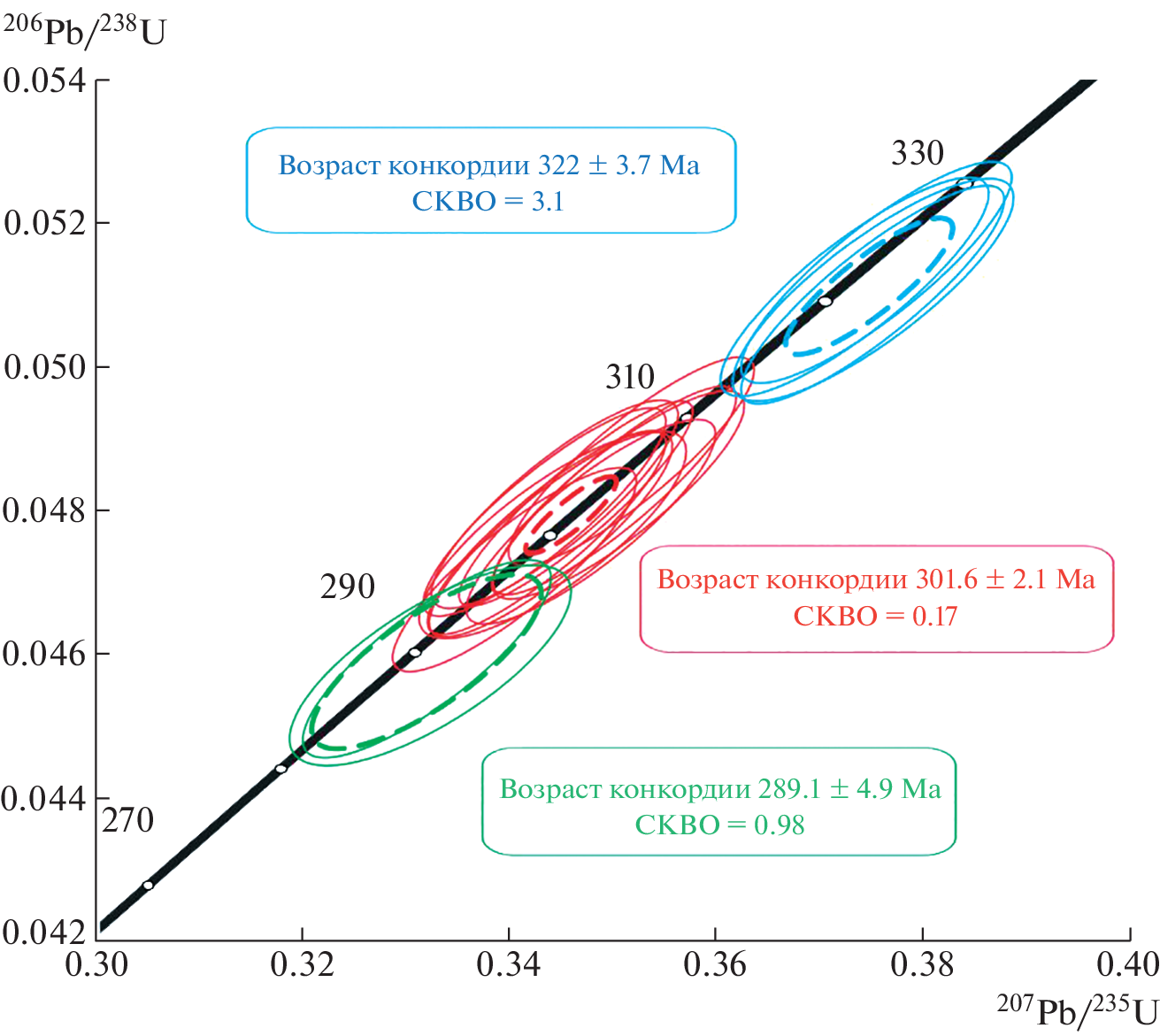 - Black L.P., Kamo S.L., Allen C.M., et al. Improved 206Pb/238U microprobe geochronology by the monitoring of a trace-element-related matrix effect; SHRIMP, ID-TIMS, ELA-ICP-MS and oxygen isotope documentation for a series of zircon standards // Chemical Geology. 2004. V. 205. P. 115–140.