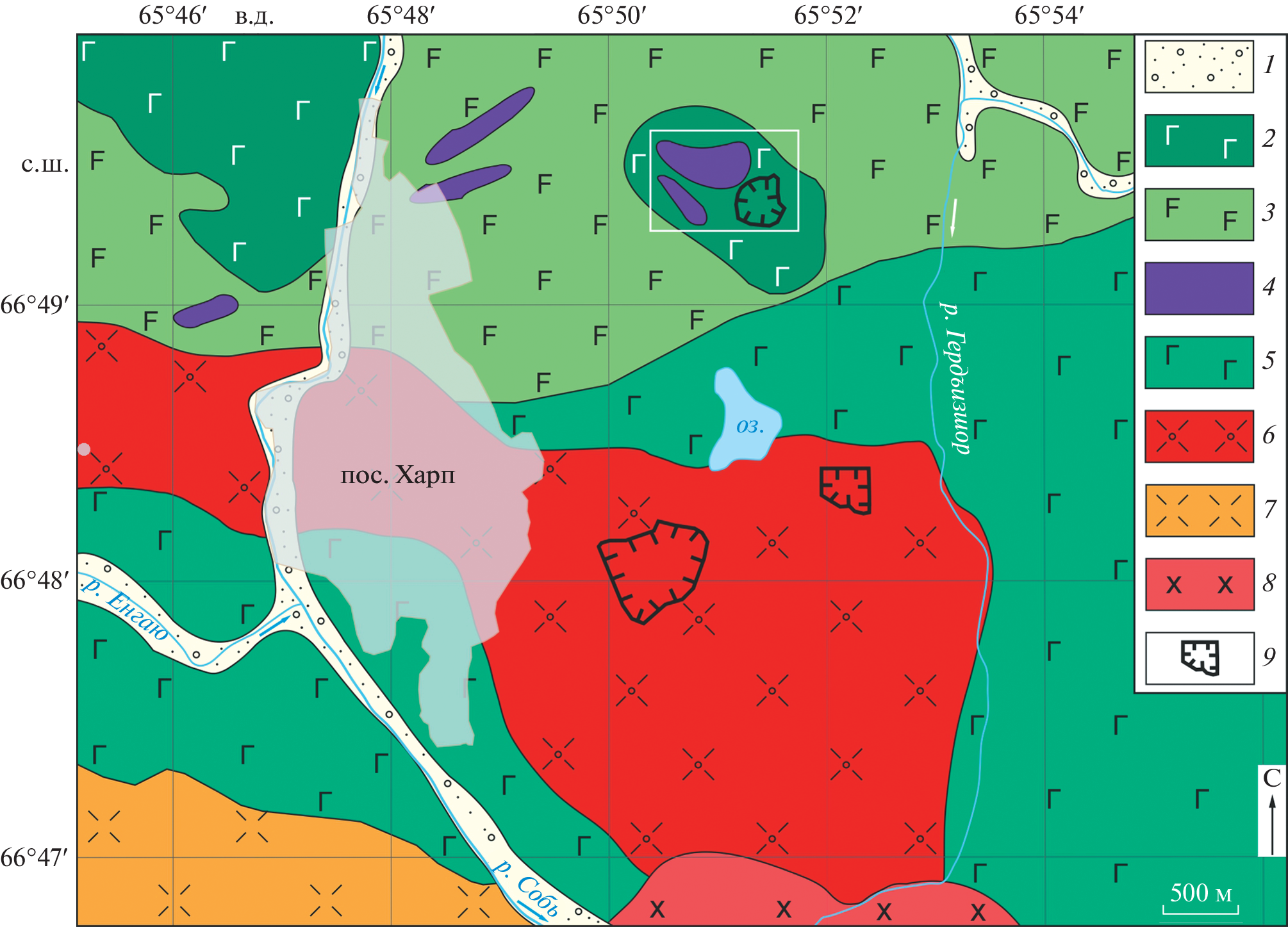 Впервые описывается новое благороднометальное (Pt–Au–Pd) рудопроявление Василиновское, обнаруженное вблизи пос. Харп Ямало-Ненецкого автономного округа. Оно связано с амфиболизированными габброидами и подчиненными пироксенитами кэршорского комплекса, датированного в основном поздним ордовиком. В этих породах развиты зоны минерализации видимой мощностью от 0.5 до 50 м (сульфидов 3–5 об. %, изредка более). В участках с рассеянной или мелко-гнездовой сульфидной вкрапленностью нередко присутствуют полевошпат–кварцевые, эпидотовые и др. прожилки. По данным пробирного анализа, в существенно сульфидных 0.5–1 кг пробах этих, в целом, малосульфидных зон содержания Pd достигают 1.4 г/т, Au – 0.8 г/т, а Pt – 0.2 г/т. Минералы ЭПГ представлены обильными выделениями теллуридов палладия микронного размера – меренскита PdTe2, темагамита Pd3HgTe3, котульскита PdTe, а также иных соединений благородных металлов – садбериита PdSb, арсенопалладинита Pd8(As,Sb)3 и некоторых других. В магнетит–халькопирит–пиритовой ассоциации, помимо указанных минералов палладия, присутствуют микровключения самородного серебра, самородного висмута и самородного олова. В более поздней полисульфидно–полевошпат–карбонатно–кварцевой ассоциации встречаются теллуриды Au и Ag, самородное золото (в том числе ртутистое), Se-содержащий аргентит, гринокит. Образование парагенезисов благородных металлов связано с позднемагматическими процессами, а также с перераспределением последующими магматогенными гидротермальными флюидами, вплоть до температуры ~250°С; давление снижалось от ~0.9–1.3 до ~0.4–0.5 кбар.