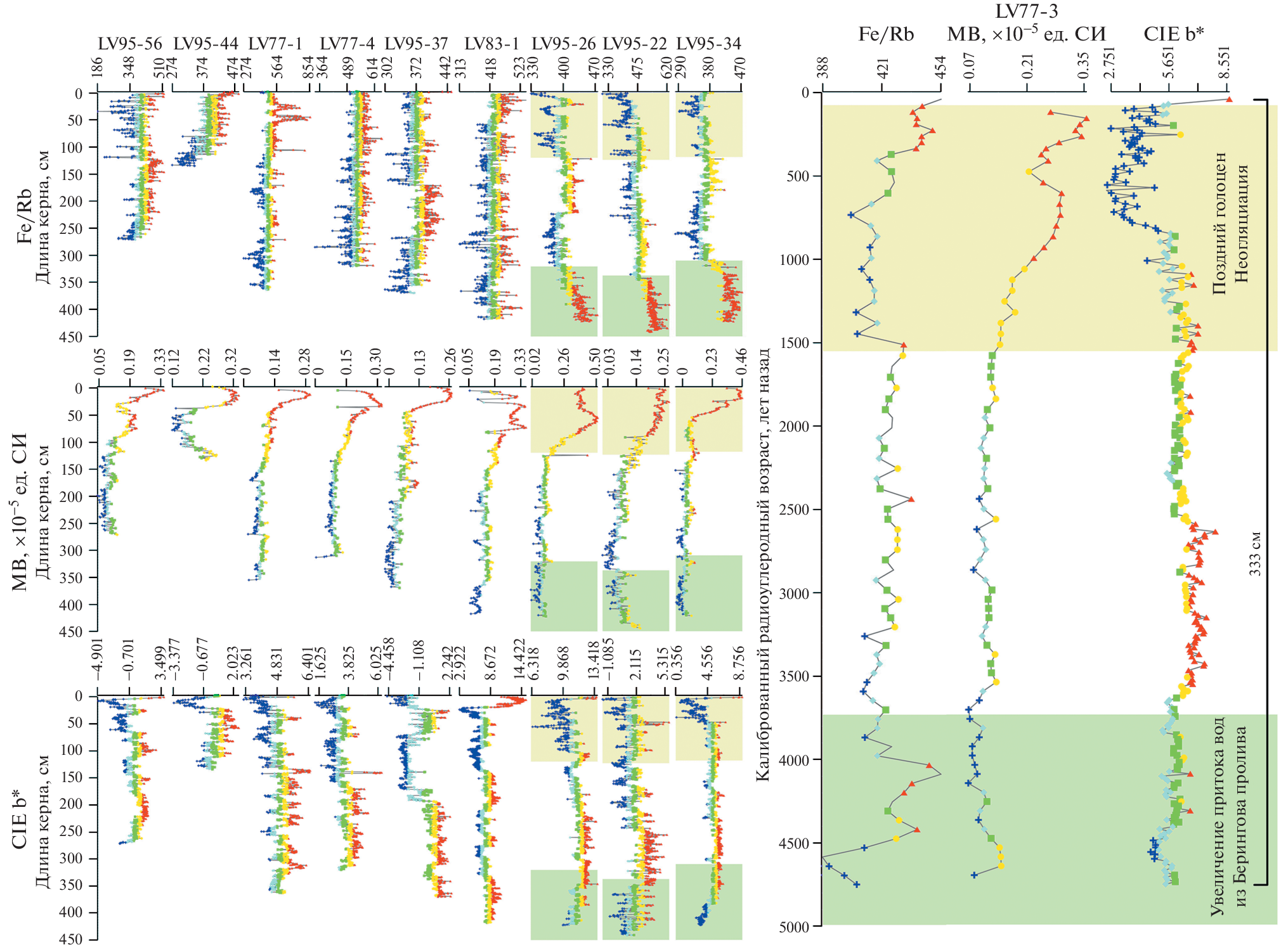 The article faces an approach in which already at sea, based on the results of an express analysis of visually similar cores of Arctic Holocene sediments and their comparison with dated and generally studied in detail cores of region’s sediments, it is possible to determine material that is promising for sequence stratigraphic correlation and paleoreconstructions. Parameters analyzed include lithological, colorimetric (CIE L*, CIE a*, CIE b*), geophysical (magnetic susceptibility – MS), and geochemical (Fe/Rb, Mn/Rb, Ti/Rb). The most informative characteristics are the CIE b* color coordinate, MS, and the Fe/Rb ratio.