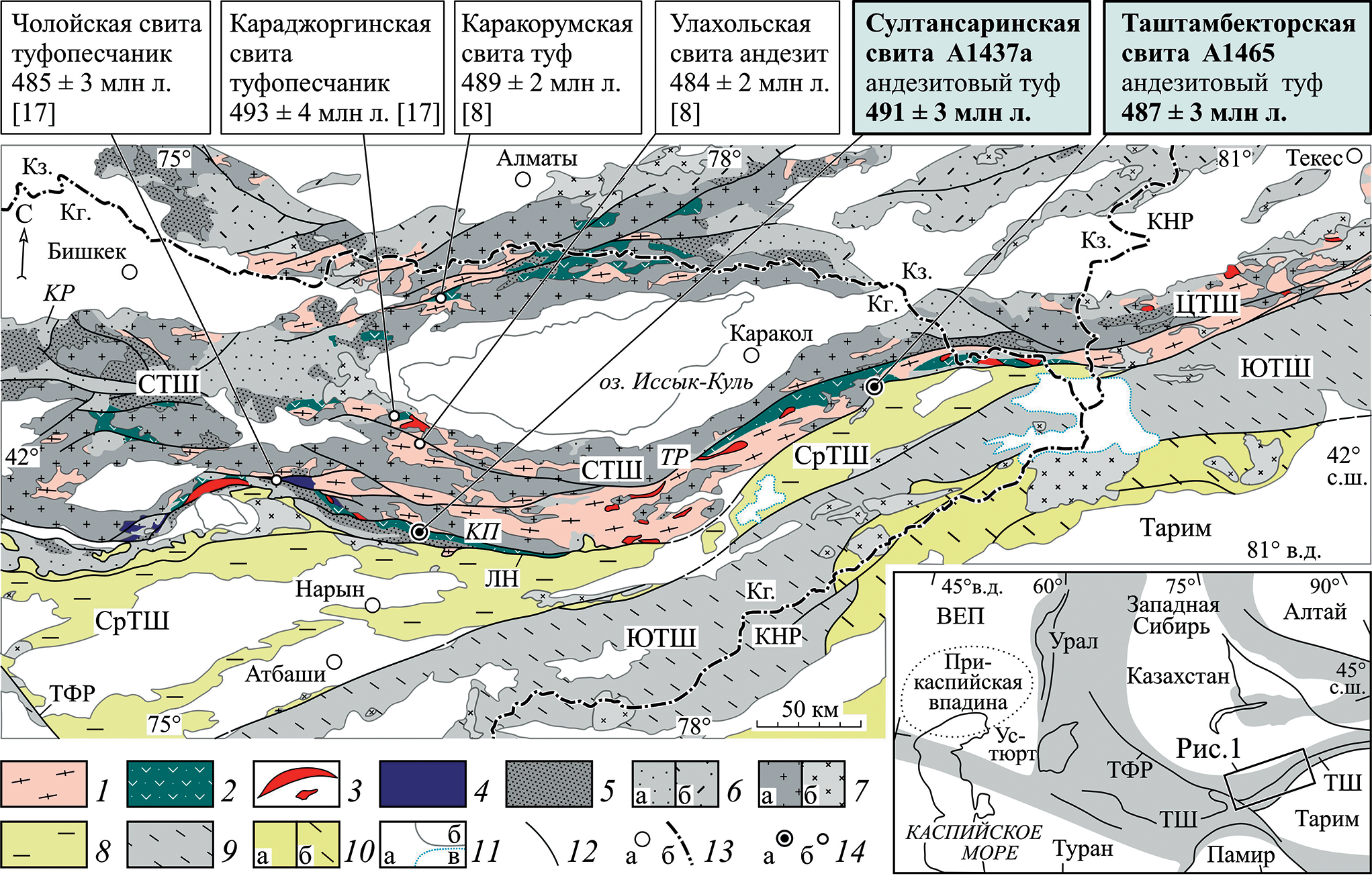 - Rojas-Agramonte Y., Kröner A., Alexeiev D.V., Jeffreys T., Khudoley A.K., Wong J., Geng H., Shu L., Semiletkin S.A., Mikolaichuk A.V., Kiselev V.V., Yang J., Seltman R. Detrital and igneous zircon ages for supracrustal rocks of the Kyrgyz Tianshan and palaeogeographic implications // Gondwana Res. 2014. V. 26. P. 957–974.
