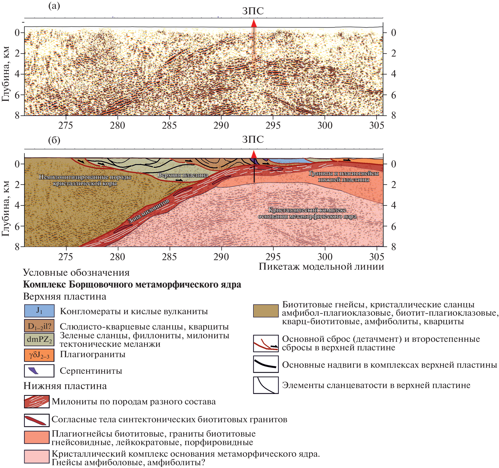 The Zabaikalian parametric borehole drilled out a metamorphic core complex on the reference geological and geophysical profile within the Central Asian fold belt, south of the Mongol-Okhotsk suture zone. In the section of the borehole drilled to a depth of 2600 m, a set of geophysical, geological and laboratory-analytical studies identified three main structural elements of metamorphic core complexes: the upper plate, detachment, and the lower plate. The upper plate (weakly metamorphosed rocks) is represented by serpentinite melange, which is separated from the underlying rocks of the lower plate by a zone of chlorite breccias (detachment). The lower plate, which is part of the crystalline basement complex, includes rocks of granite-schist and granite-plagiogneiss subcomplexes. The granite-schist subcomplex is composed of mafic and intermediate schist with amphibolites and quartzites. Biotite granite is widespread in the section; it forms layered veins with signs of synkinematic formations. According to preliminary estimates, the age of biotite granite is about 130 Ma. The schist is characterized by mylonite structure at intervals of interbedding with biotite granite veins. In accordance with data of geophysical surveys in the borehole and the petrophysical characteristics of cored rocks, the mylonite zone is the provenance of a series of inclined reflectors on the seismic reflection-CDP section, which can be traced to a depth of at least 10 km. The granite-plagiogneiss subcomplex is represented by plagiogneiss, leucogranites, and gneissic granites. In the Zabaikalian parametric borehole, a detailed section of the orshchovochny metamorphic core complex, fully characterized by core samples, of the was obtained, which should be considered as a reference for studying these structures. The investigation of this section will answer later many questions about the formation and evolution of the Central Asian fold belt.