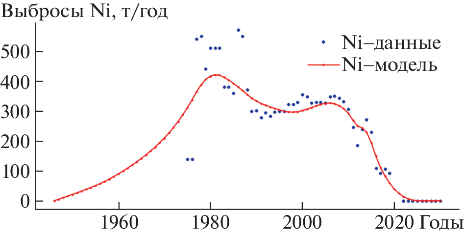The article deals with modeling the dynamics of nickel concentration in soils, water and bottom sediments of lakes, caused by emissions into the atmosphere of the Pechenganickel plant (Kola Peninsula) during the entire period of its operation. The technology of balanced identification is used, which allows, based on a mathematical description of heterogeneous geochemical processes occurring in ecosystems, to combine heterogeneous experimental data and build a computer model with an optimal balance of complexity and closeness to data. The results are presented and discussed, including estimates of the retrospective state of the simulated objects (before the start of intensive studies) and a forecast of their dynamics until 2030. According to model calculations, the intensity of Ni accumulation in soil was 2.4 and 2 times higher in bottom sediments during maximum precipitation periods (1980–2005), while according to the model forecast, after the shutdown of the plant, Ni accumulation in bottom sediments will begin to decrease and Ni will slowly leach from the soil with an intensity of 0.2 mg/m2 year.