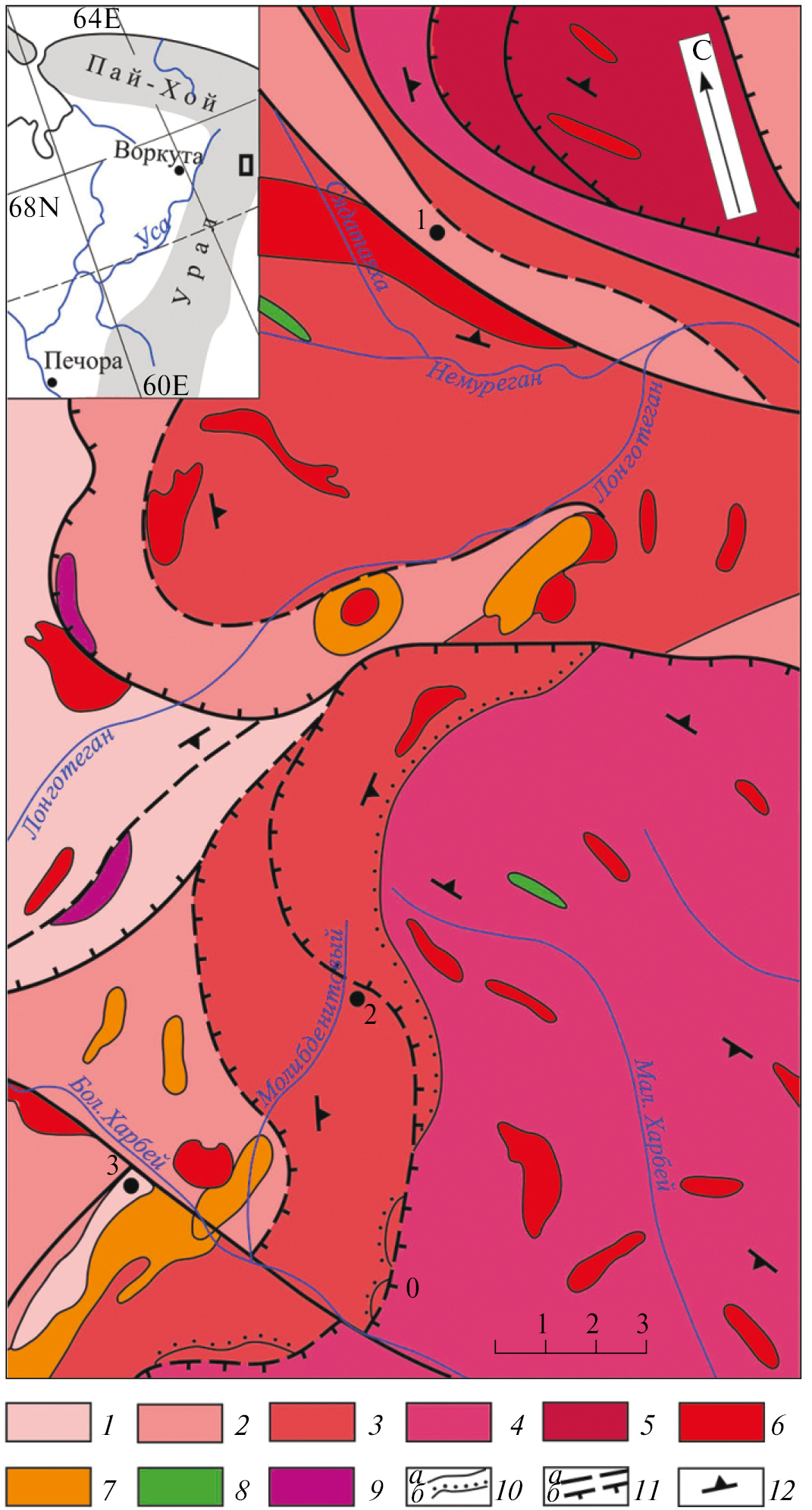 Рис. 1. Фрагмент схематической геологической карты северо-западного крыла Харбейско-Марункеуского антиклинория (составлена с использованием материалов [1, 2]). Условные обозначения: 1 – верхнерифейская немурюганская свита; 2‒3 –верхнерифейская няровейская серия: 2 – верхнерифейская минисейшорская свита, 3 – верхнерифейская верхнехарбейская свита; 4 – нижнепротерозойская ханмейхойская свита харбейского метаморфического комплекса; 5 – нижнепротерозойский марункеуский метаморфический комплекс; 6 – граниты, гранитогнейсы; 7 – метадиориты; 8 – метагаббро, метагаббродолериты; 9 – апогарцбургитовые серпентиниты; 10 – контакты геологических тел: а – стратиграфические и интрузивные, б – стратиграфических и структурных несогласий; 11 – тектонические нарушения: а – крутопадаюшие дизъюнктивы, б – надвиги, шарьяжи; 12 – элементы залегания плоскостных структур. Кружочком с номером показаны места отбора проб: 1 – № 4–28, 2 – МБ‑9, 3 – МБ‑119. На врезке прямоугольник – контур фрагмента схематической геологической карты.