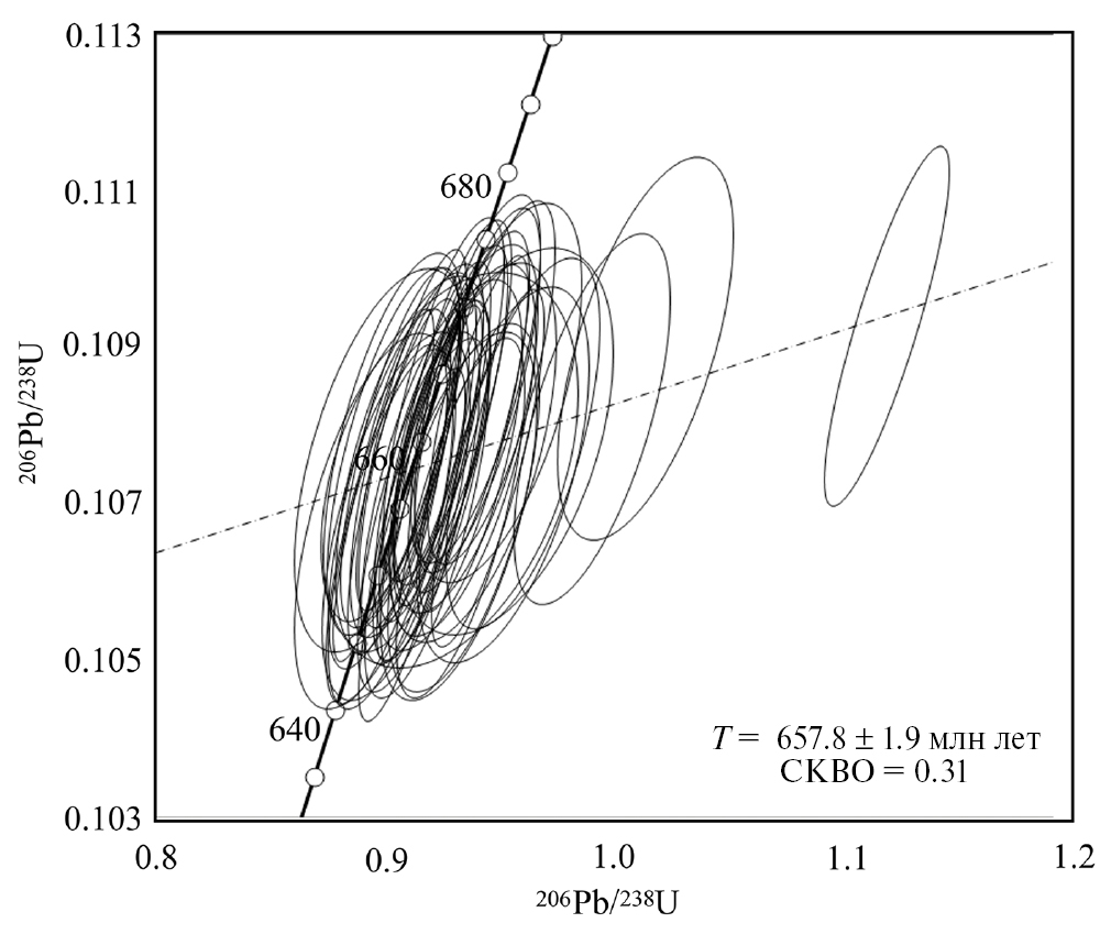 Рис. 3. Диаграмма Аренса-Везерилла с конкордией и U–Pb-возрастом (метод пересечения) циркона из метариолита немурюганской свиты (проба МБ‑119, N = 46).