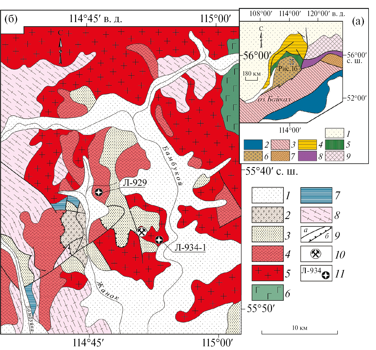 Рис. 1. а. Положение Бамбукойской вулканотектонической структуры в северной краевой части Центрально-Азиатского складчатого пояса. 1 ‒ раннепалеозойский платформенный чехол Сибирской платформы; 2 – Монголо-Охотский складчатый пояс мезозоид и Аргунский супертеррейн; 3‒6 – Центрально-Азиатский складчатый пояс: 3 – террейны, аккретированные к кратону в позднем рифее и палеозое (Селенгино-Яблоновый и Западно-Становой супертеррейны), 4 – Байкало-Патомский складчато-надвиговый пояс, 5 – Байкало-Витимский складчатый пояс, 6 – Баргузино-Витимский супертеррейн; 7 – Джугджуро-Становой раннедокембрийский супертеррейн, активизированный в мезозое; 8 – Становой сутурный шов (палеопротерозойская зона тектонического меланжа); 9 – Алданский щит. б. Схема размещения пород Жанок-Бамбукойской вулканоплутонической ассоциации и Sn-месторождения Моховое в пределах неопротерозойского Анамакит-Муйского террейна на северном фланге Баргузино-Витимского супертеррейна Восточно-Забайкальского сегмента Центрально-Азиатского складчатого пояса. По материалам Ю. А. Клейменова и др. [2]. 1 – четвертичные отложения; 2 – палеозойские вулканогенно-терригенные, терригенно-карбонатные и карбонатно-терригенные комплексы; 3 – вендские доломиты и грубообломочные породы зотовской, аматканской и гагарской свит; 4‒7 – поздненеопротерозойские геологические образования: 4‒5 – Жанок-Бамбукойская вулканоплутоническая ассоциация (4 – вулканические и субвулканические породы кислого состава жанокской свиты, 5 ‒ граниты бамбукойского комплекса), 6 – габброиды иракиндинского комплекса, 7 – черные сланцы шуриндинской толщи; 8 – ранненеопротерозойские кристаллические сланцы и гнейсо-граниты восточно-горбылокского метаморфического комплекса; 9 – разрывные нарушения: (а) разломы, (б) надвиги; 10 – Sn-месторождение Моховое; 11 – места отбора геохронологических проб.