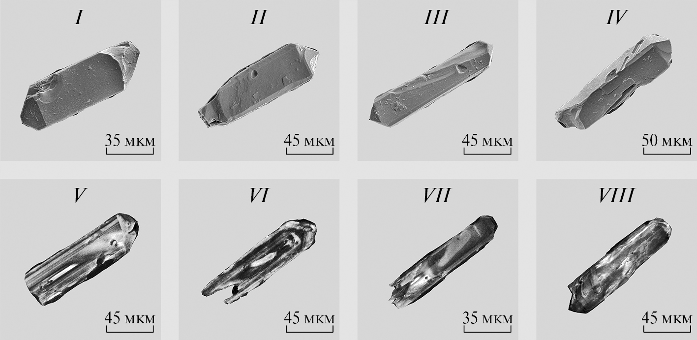 Рис. 2. Микрофотографии кристаллов циркона из трахириолита жанокской свиты (проба № Л‑929), выполненные на сканирующем электронном микроскопе ABT‑55. I–IV – в режиме вторичных электронов, V–VIII – в режиме катодолюминесценции.