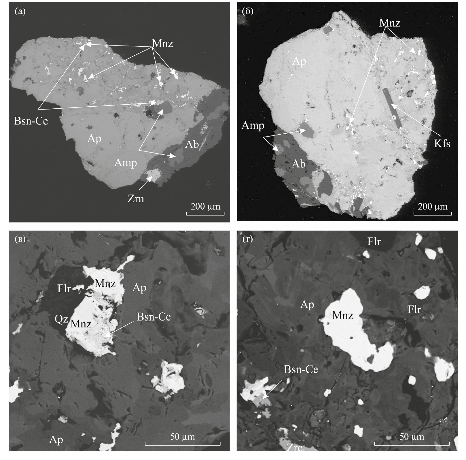 Рис. 3. Изображение BSE (в отраженных электронах). Включения монацита и других минералов в зернах апатита из редкометалльных пегматитов центральной части Бурпалинского массива. (а) – основное зерно апатита с включениями монацита; Се-бастнезита, амфибола, альбита с включением циркона; (б) – зерно апатита с включениями монацита, амфибола, К-полевым шпатом, альбитом; (в) – монацит в ассоциации с Се-бастнезитом, флюоритом и кварцем в апатите; (г) – монацит в апатите в ассоциации с Се-бастнезитом, флюоритом, цирконом и кварцем. Обозначения: Ab – альбит, Amp – амфибол, Ap – апатит, Bsn-Ce – бастнезит-(Се), Flr – флюорит, Kfs – К-полевой шпат, Mnz – монацит, Qz – кварц, Zrn – циркон.