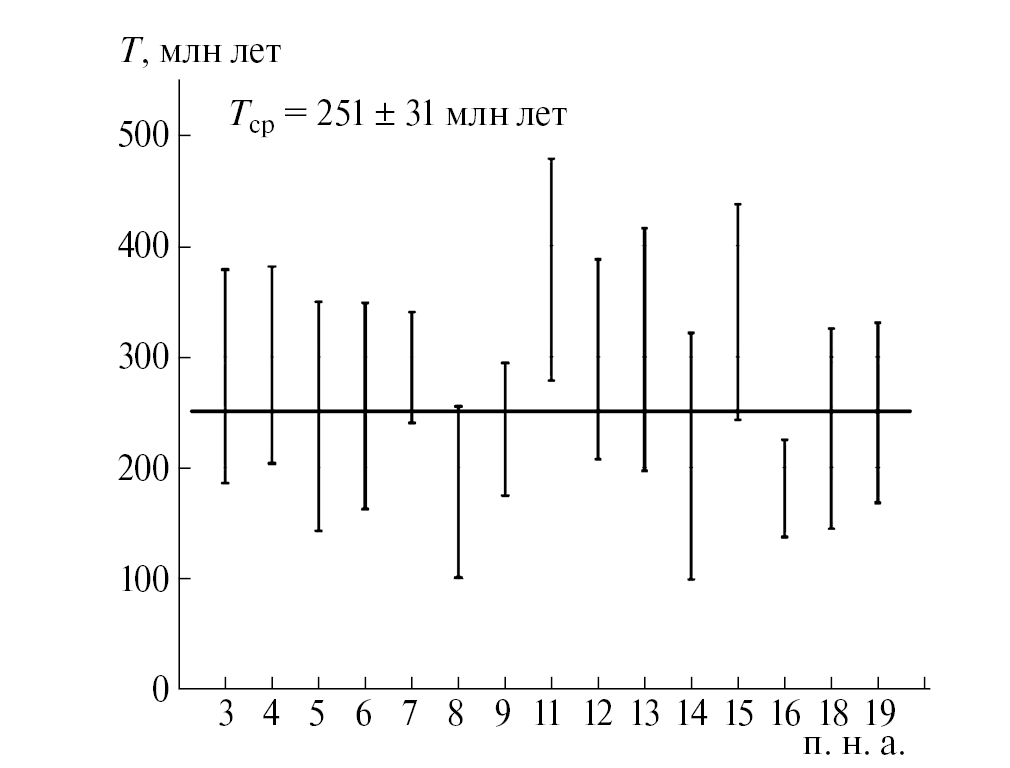 T, млн лет | 283±96 | 293±89 | 247±103 | 256±93 | 291±50 | 179±77 | 235±60 | 379±100 | 298±90 | 307±109 | 211±111 | 341±97 | 182±44 | 236±90 | 250±81 |
