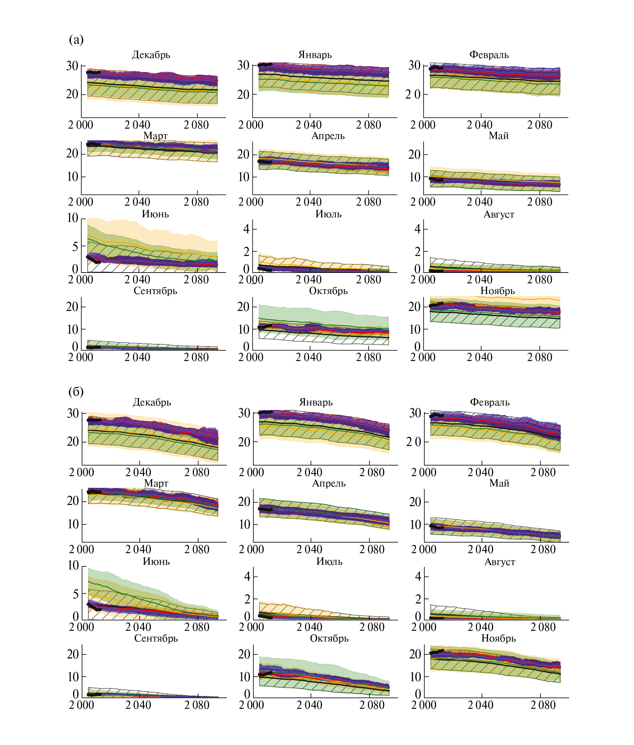 Рис. 2. Изменения площади снежного покрова (млн км2) в Евразии (скользящие 11‑летние средние) для разных месяцев по расчетам с ансамблем климатических моделей и соответствующие внутриансамблевые СКО площади снежного покрова (млн км2) в Евразии в ХХI в. для разных месяцев, полученные при сценариях SSP2-4.5 (а) и SSP5- 8.5 (б) с использованием разных байесовых весов: W1 (красный), W2 (оранжевый), W3 (зеленый), W4 (синий), а также равновзвешенные с весом W0 (черный, штриховка) в сопоставлении со спутниковыми данными CDR (жирная черная кривая).