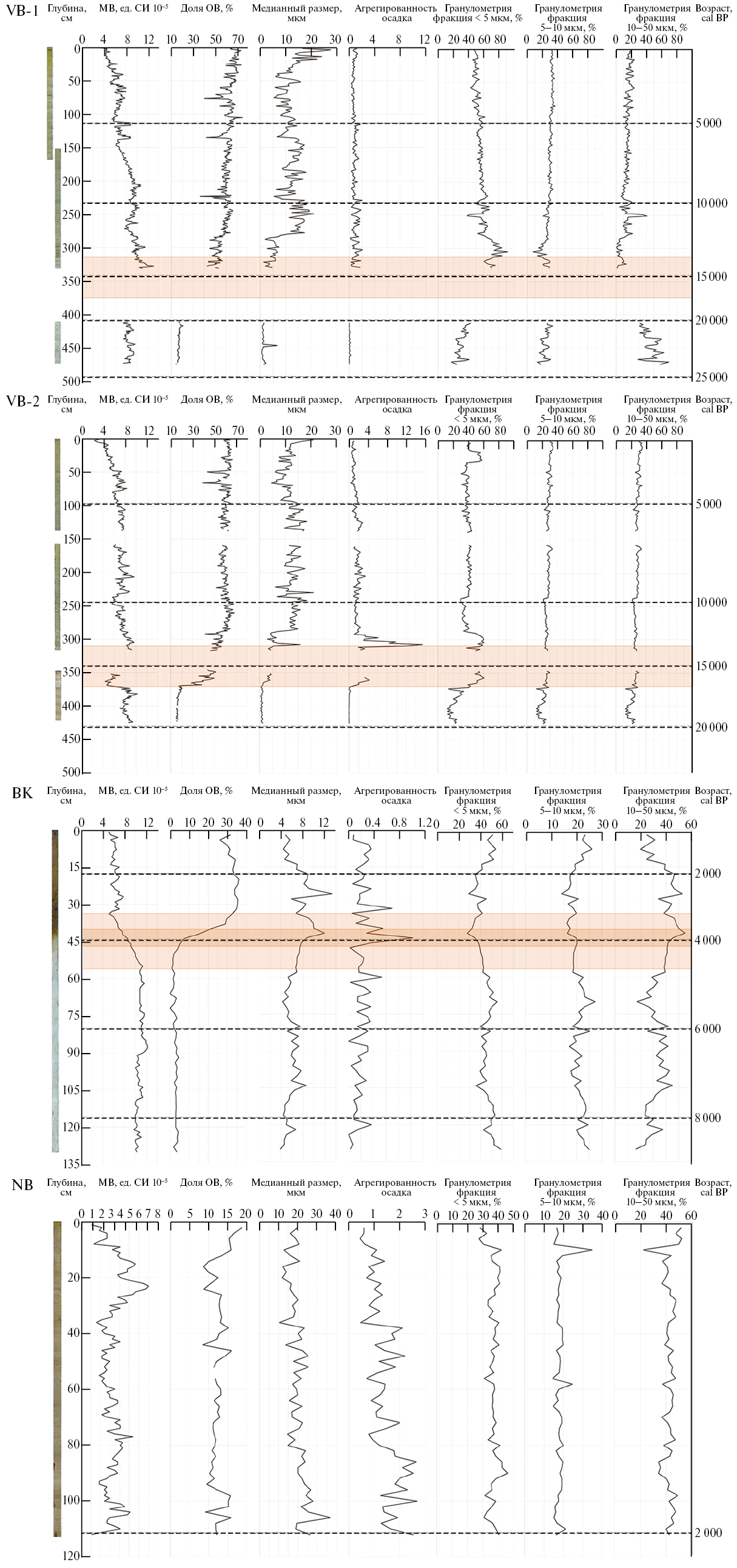 Рис. 3. Характеристики донных отложений озер Верхние Богуты (скв. VB‑1 и VB‑2), Баран-Куль (BK) и Нижние Богуты (NB), полученные разными методами. Цветом показаны зоны литологического перехода, обсуждаемые в тексте.