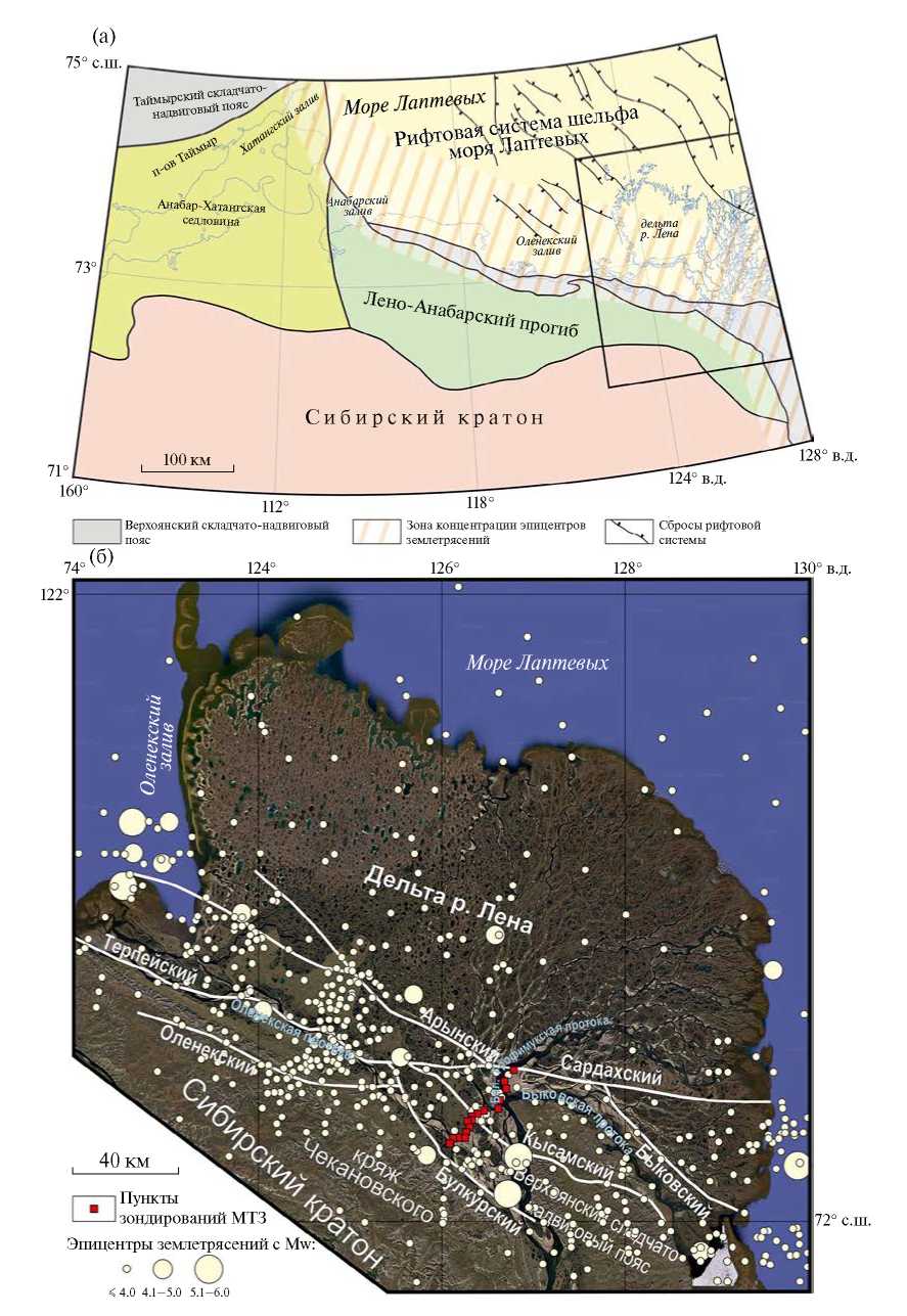 Район моря Лаптевых является северной оконечностью зоны сейсмичности, которая начинается в Охотском море, протягивается вдоль хребта Черского и отмечает границу между Евразийской и Североамериканской литосферными плитами [7]. В районе дельты р. Лены пояс разветвляется на западную и восточную ветви. Западная ветвь концентрации эпицентров землетрясений прослеживается от залива Буор-Хая, через дельту р. Лены, Оленекский и Анабарский заливы моря Лаптевых к полуострову Таймыр (рис. 1 а). За последние 100 лет в ее пределах было зарегистрировано около 400 землетрясений с магнитудами до 5.5 и гипоцентрами на глубинах до 20 км [8]. Согласно данным геологического картирования и фокальным механизмам очагов землетрясений, отдельные сегменты этих разломов интерпретируются как сбросы или взбросы с присутствием левосдвиговой компоненты [3, 4, 8, 9]. В районе дельты р. Лены (рис. 1 б) землетрясения связаны с субпараллельными зонами Оленекского, Булкурского, Терпейского, Арынского, Сардахского и Быковского разломов северо-западного простирания [3, 4].