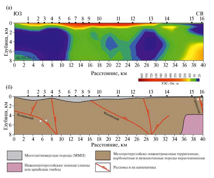 Наиболее крупная низкоомная аномалия сопротивлений расположена в юго-западной части геоэлектрического разреза (пункты зондирований 1–5 на рис. 2 а). Значительная площадь аномалии и сложная конфигурация определяются близким расположением нескольких субпараллельных разломов северо-западного простирания (рис. 2 б, рис. 3). Такая система разломов создает проводящие аномалии сложной формы и понижает измеренные значения сопротивлений на близко расположенных пунктах зондирования. Несмотря на это, помимо субвертикальной части аномалии, соответствующей зонам динамического влияния разломов между пунктами зондирований 2 и 5, отчетливо выделяется наклонная зона, которая может быть сопоставлена с Булкурским сдвиго-надвигом. Современная флюидная насыщенность зон динамического влияния разломов, создающих крупную низкоомную аномалию, а также их пространственное положение в зоне наибольшей концентрации очагов землетрясений на северо-восточной окраине Сибирского кратона [4, 8], свидетельствует в пользу отнесения этих разломов к категории активных.