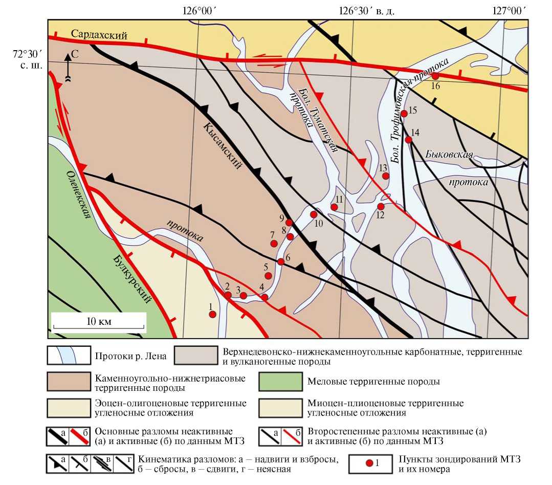 Выполненный профиль МТЗ (рис. 1, 3) находится в пределах Бахстахско-Хараулахской зоны Верхоянского складчато-надвигового пояса, расположенной в районе дельты р. Лены, между ее Булкурской и Быковской протоками [3]. Разломные ограничения зоны на исследуемом участке представлены Булкурским надвигом на юго-западе и Сардахским левым сдвигом на северо-востоке (рис. 3). В свою очередь, Бахстахско-Хараулахская зона разделена на два крупных блока Кысамским надвигом северо-западного простирания. Он выражен серией надвиговых пластин с амплитудой горизонтальных смещений от первых сотен метров до 1.5–2 км.