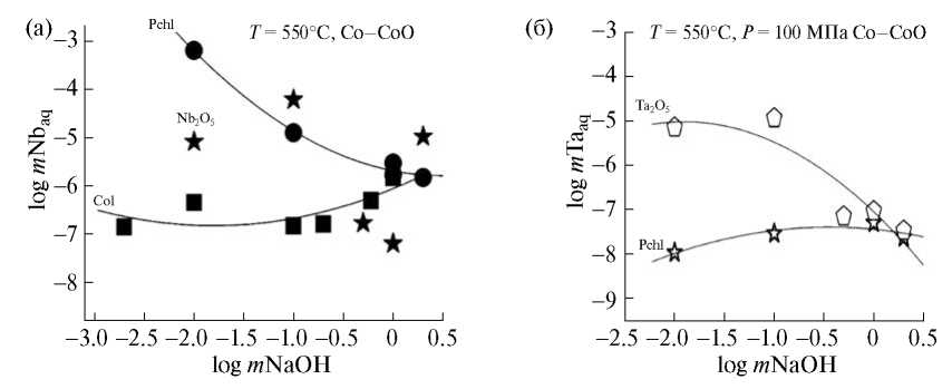 Как уже отмечалось выше, в растворах NaOH разной концентрации при 550°C и 100 МПа в растворах NaOH оксид тантала имеет отрицательную концентрационную зависимость растворимости. Экспериментально установлено, что при давлении флюида 50 МПа концентрационная зависимость растворимости оксида тантала в растворах NaOH носит более сложный характер. С ростом концентрации NaOH от 0.01 до 0.5m понижение давления флюида с 100 до 50 МПа приводит к уменьшению растворимости Та2О5 на 1 порядок (рис. 7 б). При более высоких концентрациях NaOH с понижением давления флюида со 100 до 50 МПа содержание тантала в растворе наоборот увеличивается примерно на один порядок. Однако растворимость оксида тантала в щелочных растворах остается на очень низком уровне и находится в пределах n·10–7–10–5 m.