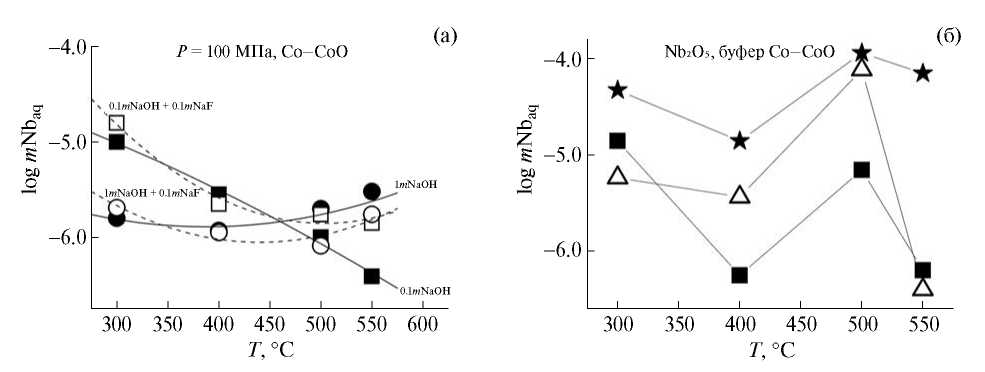 Установлено, что при растворении пирохлора в 0.1m NaOH растворе (рис. 4 а) наблюдается четко выраженная отрицательная зависимость растворимости пирохлора от температуры, близкая к линейной, то есть при повышении температуры равновесное содержание ниобия линейно уменьшается с n·10–5 m при 300°С до n·10–6.5 m при 550°С, что связано с образованием малорастворимых ниобиевых фаз. При растворении пирохлора в 1m NaOH-растворе с ростом температуры равновесное содержание ниобия (mNb) практически не изменяется, оставаясь на уровне n·10–5.5–10–5.8 m. Введение в раствор NaOH небольших концентраций фторида натрия (0.1m NaF) в области низких температур (300–400°С) практически не влияет на растворимость пирохлора, а в области высоких температур (500– 550°С) увеличивает растворимость минерала на 0.5–1.5 порядка.