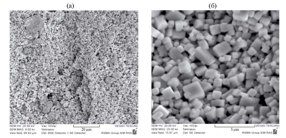 Рис. 8. Кристаллы, образовавшиеся при растворении: а) колумбита в 0.1m NaOH-растворе; б) пирохлора в 1m NaOH-растворе (Т = 550оС, Р = 100 МПа, буфер Со–СоО).
