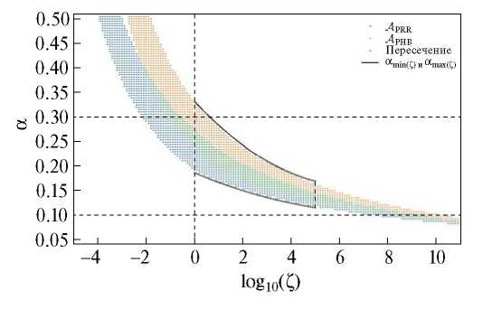Рис. 3. Интервалы значений α и ζ, при которых одновременно выполняются все 6 условий из табл. 2 при РНВ и РВВ. Их пересечение изображено зеленым цветом. Комбинации параметров Андраде, которые наиболее подходят для описания реологии Земли, находятся между параболами и .