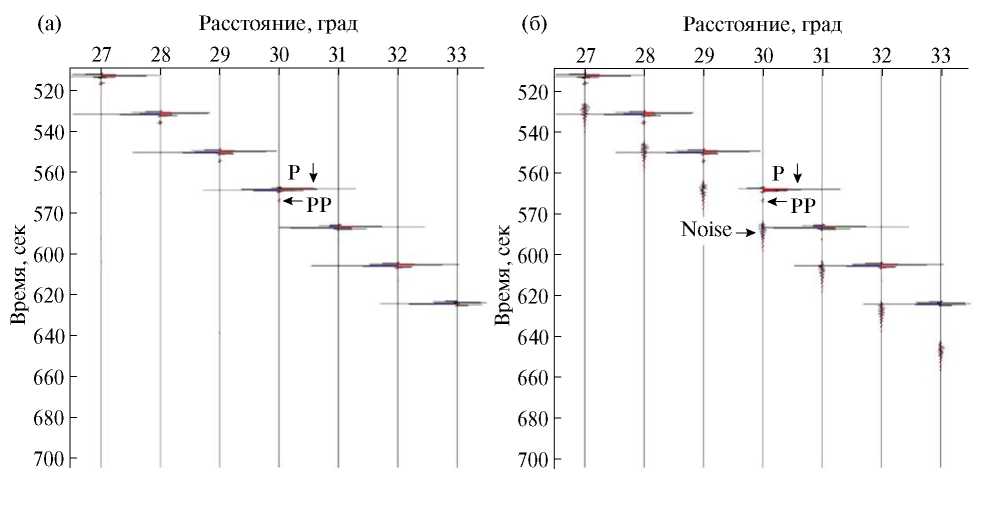На рис. 1 приведены волновые поля радиальной (вертикальной) компоненты ur сейсмического поля с несущей частотой 1 герц для однородного шара с радиусом Земли R1 = 6371 километров. Однородный шар имеет параметры: Vp = 5.8, Vs = 3.45, = 2.72. По горизонтали приведены расстояния в градусах. По вертикали – время в секундах (возрастает вниз). При этом на рис. 1 а используется новая асимптотика (11). А на рис. 1 б – классическая асимптотика (13). Символы P и PP означают прямую и однократную продольные волны. В этом случае кинематика для угла φ для прямой волны P будет даваться известным выражением . Соответственно кинематика однократной продольной волны PP – . Для угла в 30 градусов будет секунд, а секунд. Приход этих волн обозначен символами P и PP на рис. 1. Далее все кратные волны распространяются по граням вписанных в круг многоугольников. В пределе многоугольники стремятся к окружности. Длина дуги окружности для угла φ в 30 градусов будет . Поэтому для времен больших, чем , кратных продольных волн P быть не может. Таким образом, волновая фаза, приходящая на рис. 1 б за P- и PP-волнами, заведомо является помехой, так как она регистрируется на времени (возрастает вниз) большем 580 секунд. Она обозначена символом Noise на рис. 1 б. Из литературы известны и другие асимптотики (например, [11]). Но асимптотики из [11] приводят к формулам (13), то есть результаты ее применения к волновым задачам будут совпадать с классической асимптотикой.