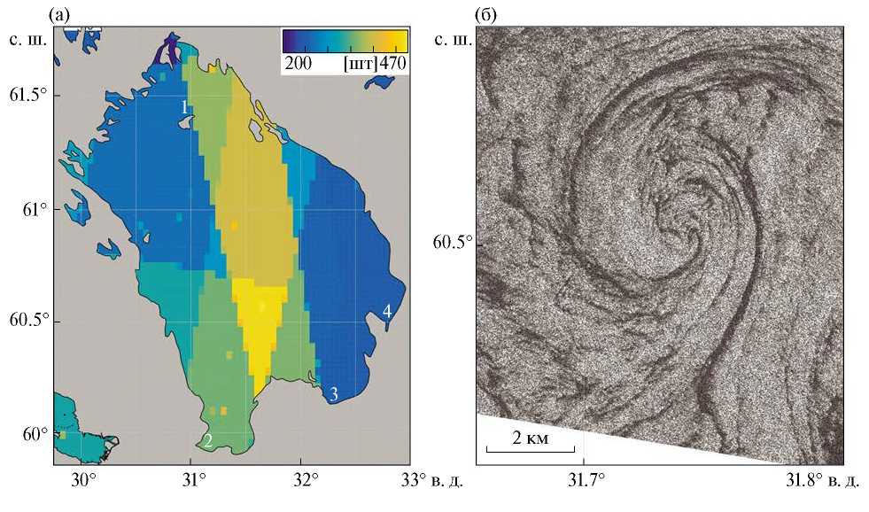 Рис. 1. а – Карта покрытия радиолокационными изображениями Ладожского озера с мая по октябрь 2019–2022 гг. (шкала представлена в количестве РЛИ), где цифрами обозначены: 1 – остров Валаам, 2 – бухта Петрокрепость, 3 – Волховская губа, 4 – Свирская губа. б – Фрагмент РЛИ Sentinel-1 от 19.08.2020 04:08 (UTC), на котором отображено проявление циклонической вихревой структуры.
