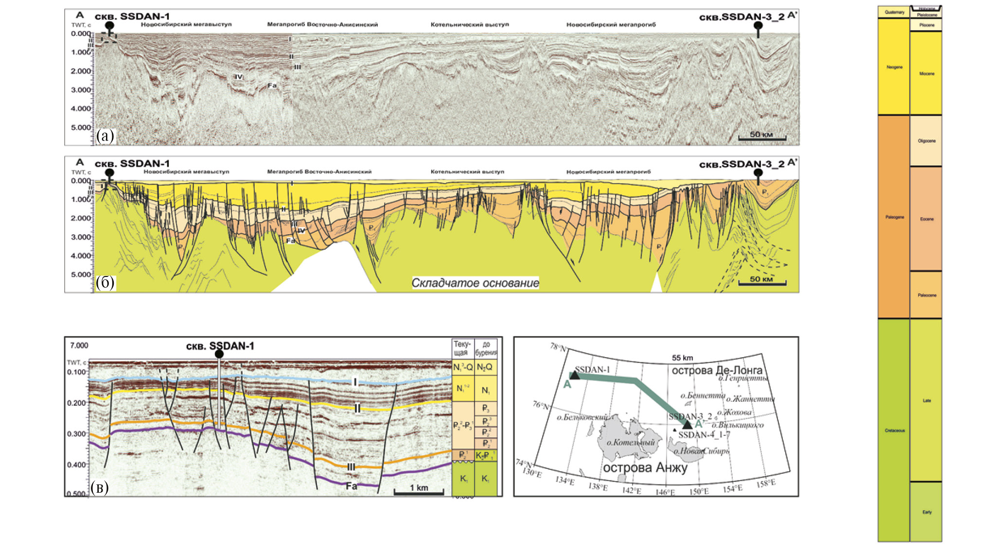 Стратиграфическое бурение не показало присутствие в разрезе отложений древнее верхнего баррема – нижнего апта. Не исключено, что более древние (верхнеюрско-готеривские?) отложения, известные на Новосибирских островах [16] и Чукотке [7], согласно подстилают верхнебарремские-нижнеаптские, поскольку на сейсмических разрезах не фиксируется угловых несогласий древнее подошвы палеоцена. Вместе с тем региональные сейсмические данные не исключают возможность выделения и более древних, чем датированные в стратиграфических скважинах ранним палеоценом, постскладчатых осадочных комплексов в более глубокопогруженных западных частях лаптевоморского шельфа (апт-альбских и/или верхнемеловых?). Этот ключевой вопрос региональной геологии будет предметом отдельного комплексного исследования с учетом полученных данных бурения и детального сейсмостратиграфического расчленения осадочного чехла шельфа моря Лаптевых.