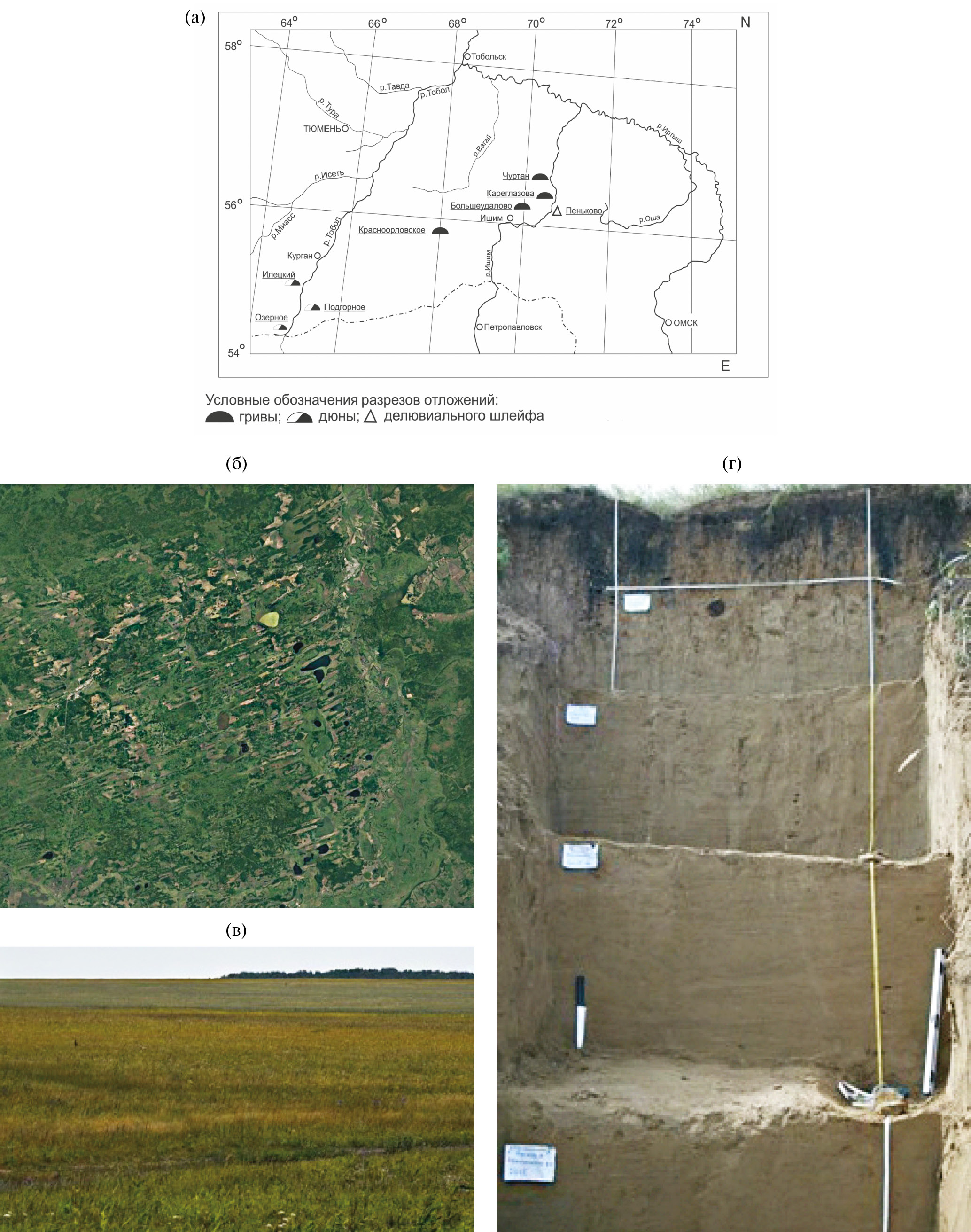 Рис. 1. а) Месторасположение изученных разрезов, б) гривы на космоснимке, в–г) общий вид и разрез гривы у с. Красноорловское (фото С. И. Ларин).