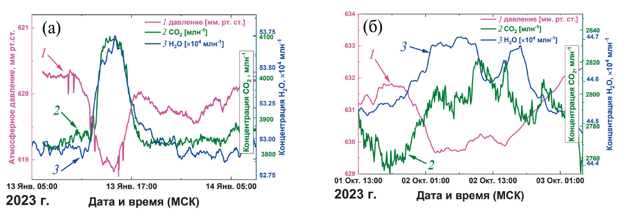 Рис. 5. Примеры “пампинг эффекта” при скачках давления на 1.5 (а) и 3 (б) мм рт. ст. в тупиковом тоннеле БНО в 2023 г.: изменение давления – розовая линия 1, концентрации CO2 – зеленая линия 2, концентрации H2O – синяя линия 3.