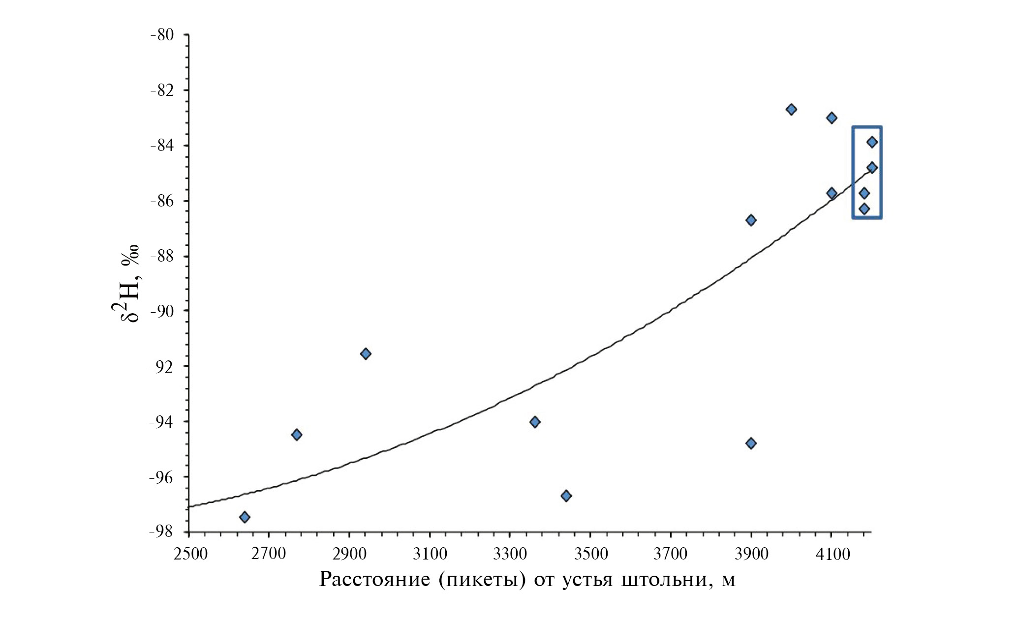 Рис. 4. Изменение значений δ2Н в выходах вод по простиранию штольни Нейтрино (по оси x дано расстояние в м от устья штольни). Линией показана общая тенденция изменения δ2Н, прямоугольным боксом обведены фигуративные точки источников в конце штольни, данные по которым приведены в табл. 1.