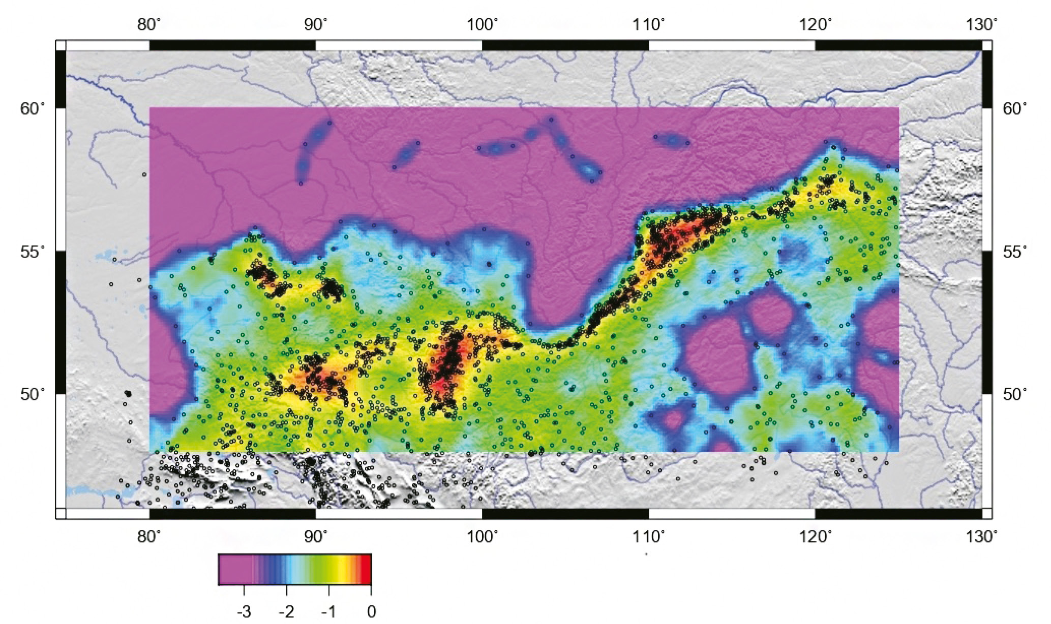 На рис. 1 приведена карта оценки вариаций сейсмической активности в регионах юга Сибири. Карта построена по данным каталога землетрясений за 1982–2021 гг., полученного объединением каталогов из ежегодников “Землетрясения в СССР” за 1982–1991 гг. (оцифрованная версия доступна по ссылке http://www.wdcb.ru/sep/seismology/cat_USSR.ru.html), ежегодников “Землетрясения в Северной Евразии” (1992–2021) (http://zeus.wdcb.ru/wdcb/sep/hp/seismology.ru/ cat_N_Eurasia.ru.html) и каталога Международного сейсмологического центра ISC (http://www.isc.ac.uk). Дубли в каталоге выявлены и удалены по методике работы [14]. Проведена также декластеризация каталога по методике работы [15]. Результирующий каталог доступен по ссылке https://www.itpz-ran.ru/wp-content/rnf/rnf-20-17- 00180/S_Siberia_ForUpload_MainShocks.txt. Локальные оценки представительной магнитуды для каталога (карта доступна по ссылке https://www.itpz-ran.ru/wp-content/rnf/rnf-20-17-00180/Представительная_магнитуда.pdf) позволяют принять значение Mc = 3.5 в качестве региональной оценки. Регион исследования сканируется кругами с постоянным радиусом R = 100км. Шаг сканирования D=0.1 град. Величина , где – оценка числа землетрясений в ячейке с магнитудой M ≥ 3.5, вычисленная по формуле (1). Значения активности привязаны к центрам кругов сканирования.