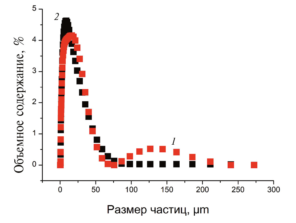 Рис. 2. Распределение размера частиц в почвенных пастах из образцов чернозема при перемешивании: 1 – 1200 об/мин; 2 – 200 об/мин.